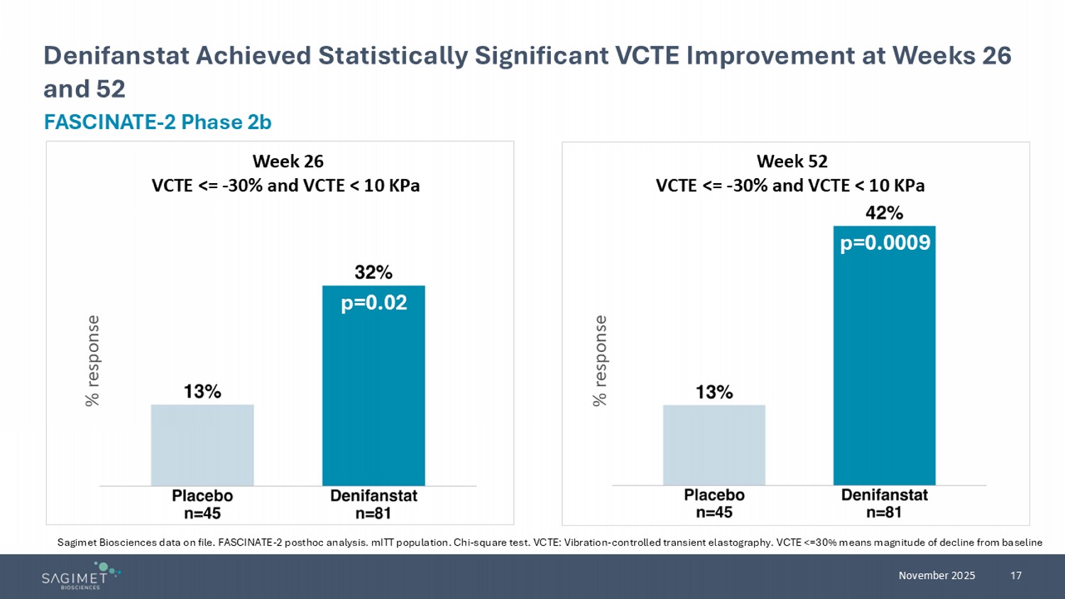17 November 2025 Denifanstat Achieved Statistically Significant VCTE Improvement at Weeks 26 and 52 FASCINATE - 2 Phase 2b Sagimet Biosciences data on file. FASCINATE - 2 posthoc analysis. mITT population. Chi - square test. VCTE: Vibration - controlled transient elastography. VCTE <=30% means magnitude of decline from baseline p=0.0009 ​ % response % response p=0.02 ​ Week 26 VCTE <= - 30% and VCTE < 10 KPa Week 52 VCTE <= - 30% and VCTE < 10 KPa