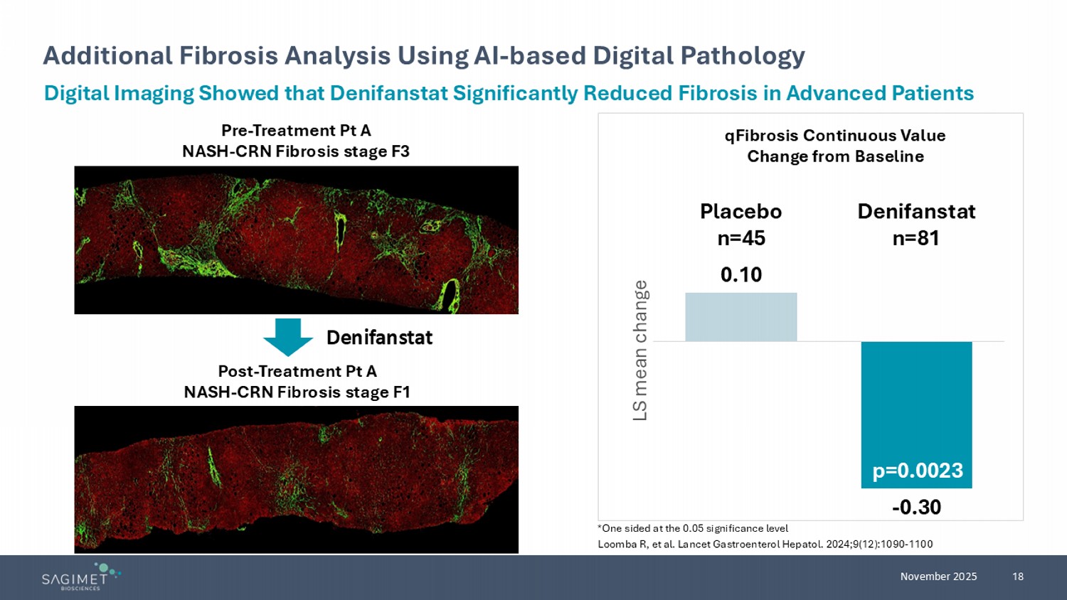 18 November 2025 Additional Fibrosis Analysis Using AI - based Digital Pathology Digital Imaging Showed that Denifanstat Significantly Reduced Fibrosis in Advanced Patients Pre - Treatment Pt A NASH - CRN Fibrosis stage F3 Post - Treatment Pt A NASH - CRN Fibrosis stage F1 Denifanstat 0.10 - 0.30 Placebo n=45 Denifanstat n=81 LS mean change qFibrosis Continuous Value Change from Baseline p=0.0023 *One sided at the 0.05 significance level Loomba R, et al. Lancet Gastroenterol Hepatol. 2024;9(12):1090 - 1100