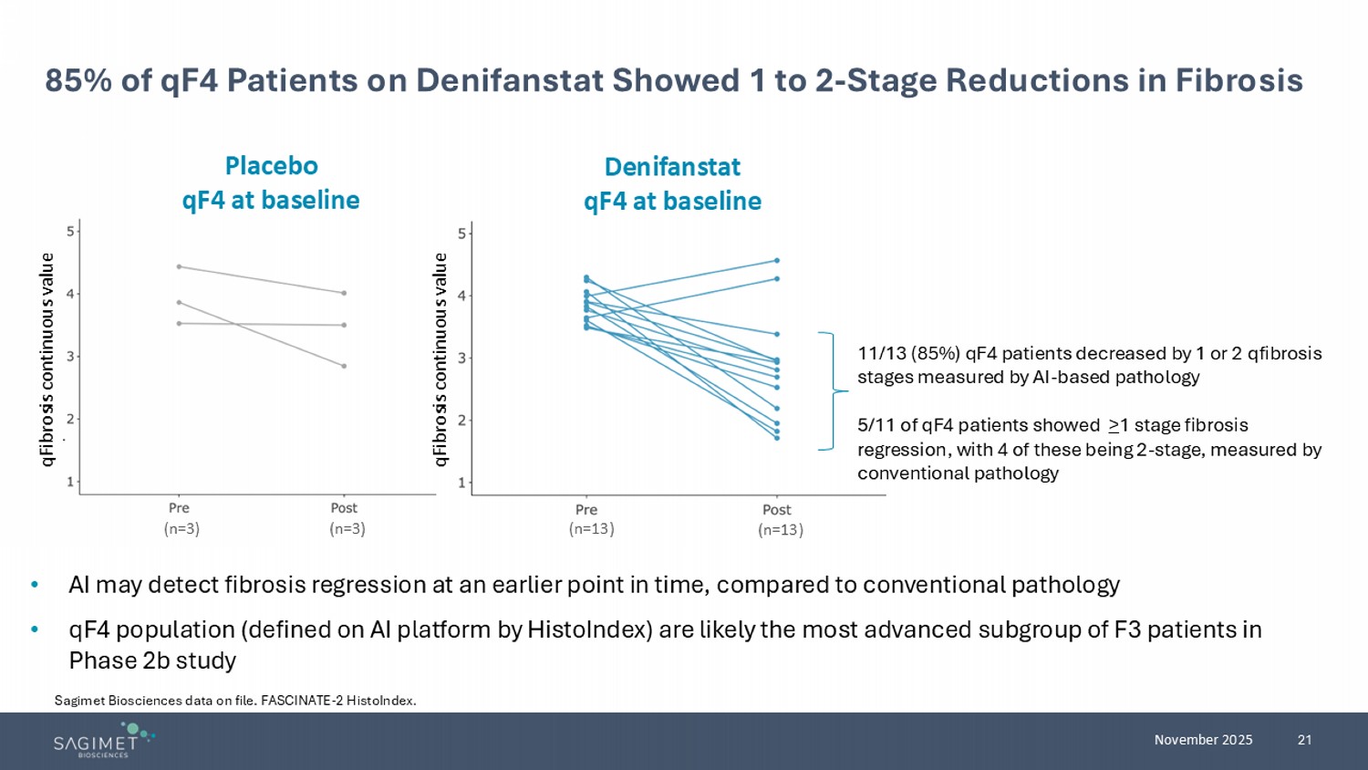21 November 2025 85% of qF4 Patients on Denifanstat Showed 1 to 2 - Stage Reductions in Fibrosis • AI may detect fibrosis regression at an earlier point in time, compared to conventional pathology • qF4 population (defined on AI platform by HistoIndex ) are likely the most advanced subgroup of F3 patients in Phase 2b study (n=3) ​ (n=3) ​ (n=13) ​ (n=13) ​ Placebo qF4 at baseline ​ Denifanstat qF4 at baseline qFibrosis continuous value qFibrosis continuous value 11/13 (85%) qF4 patients decreased by 1 or 2 qfibrosis stages measured by AI - based pathology 5/11 of qF4 patients showed > 1 stage fibrosis regression, with 4 of these being 2 - stage, measured by conventional pathology Sagimet Biosciences data on file. FASCINATE - 2 HistoIndex .