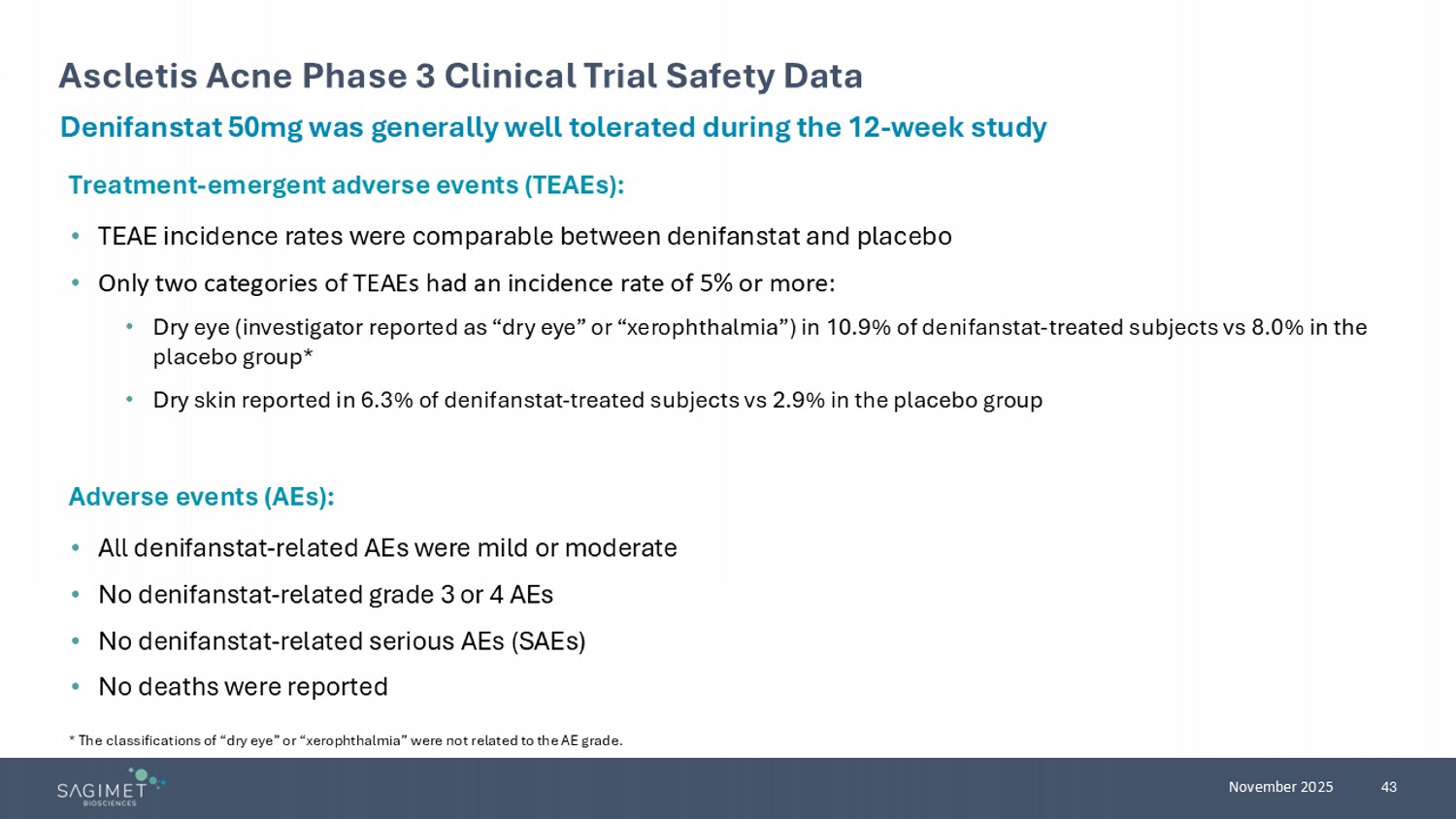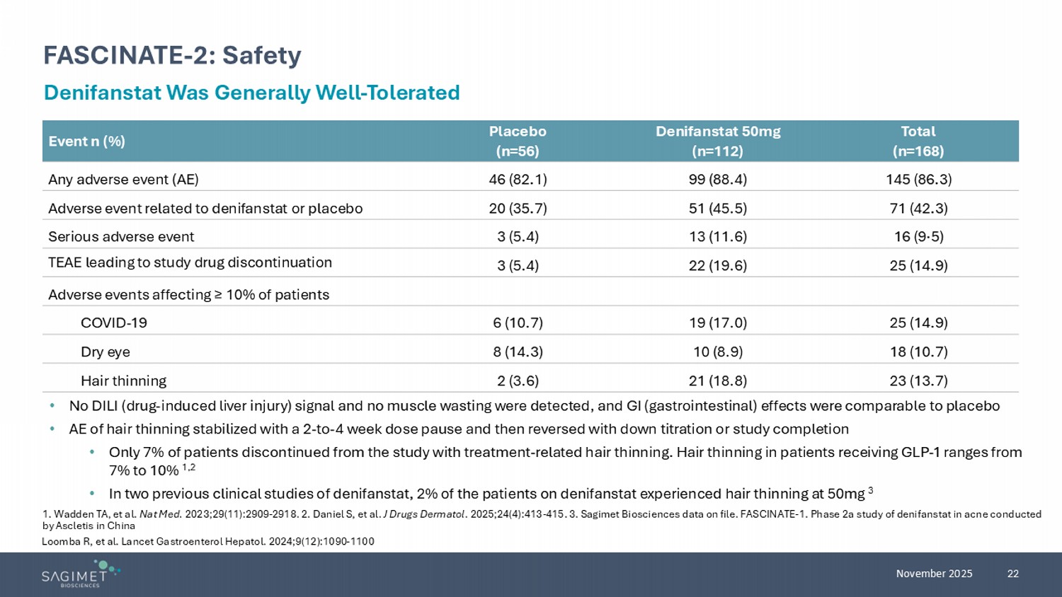 22 November 2025 FASCINATE - 2: Safety Denifanstat Was Generally Well - Tolerated • No DILI (drug - induced liver injury) signal and no muscle wasting were detected, and GI (gastrointestinal) effects were comparabl e to placebo • AE of hair thinning stabilized with a 2 - to - 4 week dose pause and then reversed with down titration or study completion • Only 7% of patients discontinued from the study with treatment - related hair thinning. Hair thinning in patients receiving GLP - 1 ranges from 7% to 10% 1,2 • In two previous clinical studies of denifanstat, 2% of the patients on denifanstat experienced hair thinning at 50mg 3 Total (n=168) Denifanstat 50mg (n=112) Placebo (n=56) Event n (%) 145 (86.3) 99 (88.4) 46 (82.1) Any adverse event (AE) 71 (42.3) 51 (45.5) 20 (35.7) Adverse event related to denifanstat or placebo 16 (9·5) 13 (11.6) 3 (5.4) Serious adverse event 25 (14.9) 22 (19.6) 3 (5.4) TEAE leading to study drug discontinuation Adverse events affecting ≥ 10% of patients 25 (14.9) 19 (17.0) 6 (10.7) COVID - 19 18 (10.7) 10 (8.9) 8 (14.3) Dry eye 23 (13.7) 21 (18.8) 2 (3.6) Hair thinning 1. Wadden TA, et al. Nat Med. 2023;29(11):2909 - 2918. 2. Daniel S, et al. J Drugs Dermatol . 2025;24(4):413 - 415. 3. Sagimet Biosciences data on file. FASCINATE - 1. Phase 2a study of denifanstat in acne conducted by Ascletis in China Loomba R, et al. Lancet Gastroenterol Hepatol. 2024;9(12):1090 - 1100