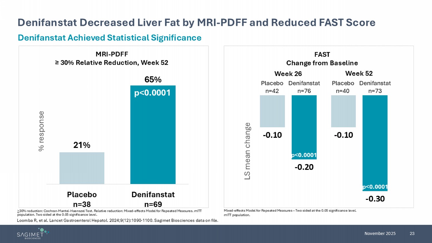 23 November 2025 Denifanstat Decreased Liver Fat by MRI - PDFF and Reduced FAST Score > 30% reduction: Cochran - Mantel - Haenszel Test. Relative reduction: Mixed - effects Model for Repeated Measures. mITT population. Two sided at the 0.05 significance level. Denifanstat Achieved Statistical Significance 21% 65% Placebo n=38 Denifanstat n=69 % response p<0.0001 MRI - PDFF ≥ 30% Relative Reduction, Week 52 FAST Change from Baseline - 0.10 - 0.10 - 0.20 - 0.30 LS mean change p<0.0001 p<0.0001 Week 26 Week 52 Placebo n=42 Denifanstat n=76 Placebo n=40 Denifanstat n=73 Mixed - effects Model for Repeated Measures – Two sided at the 0.05 significance level. mITT population. Loomba R, et al. Lancet Gastroenterol Hepatol. 2024;9(12):1090 - 1100. Sagimet Biosciences data on file.
