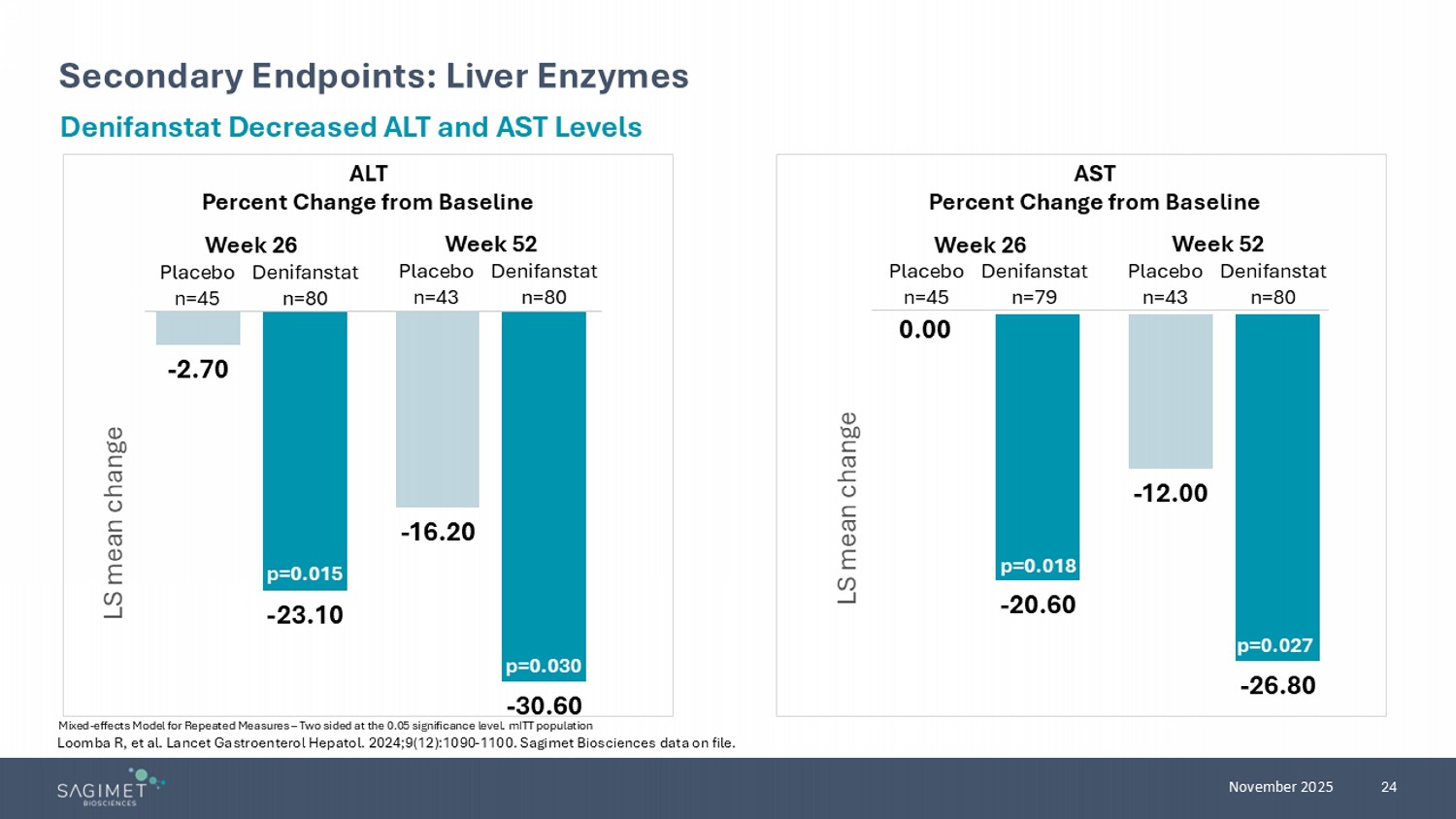 24 November 2025 Secondary Endpoints: Liver Enzymes Mixed - effects Model for Repeated Measures – Two sided at the 0.05 significance level. mITT population Denifanstat Decreased ALT and AST Levels ALT Percent Change from Baseline AST Percent Change from Baseline - 2.70 - 16.20 - 23.10 - 30.60 LS mean change p=0.015 p=0.030 0.00 - 12.00 - 20.60 - 26.80 LS mean change p=0.018 p=0.027 Week 26 Week 52 Week 26 Week 52 Placebo n=45 Denifanstat n=80 Placebo n=43 Denifanstat n=80 Placebo n=45 Denifanstat n=79 Placebo n=43 Denifanstat n=80 Loomba R, et al. Lancet Gastroenterol Hepatol. 2024;9(12):1090 - 1100. Sagimet Biosciences data on file.