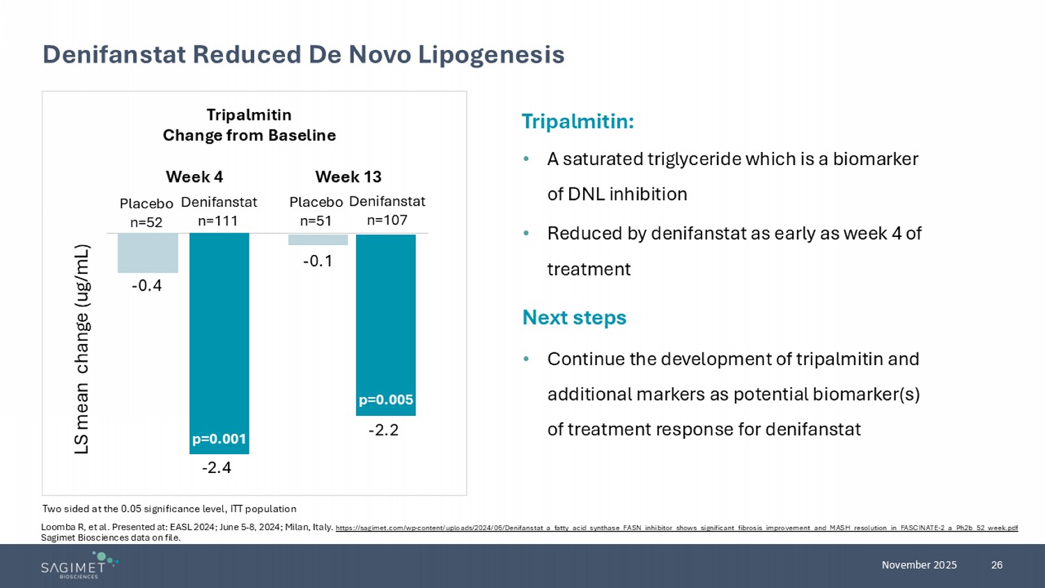 26 November 2025 Denifanstat Reduced De Novo Lipogenesis Two sided at the 0.05 significance level , ITT population Tripalmitin : • A saturated triglyceride which is a biomarker of DNL inhibition • Reduced by denifanstat as early as week 4 of treatment Next steps • Continue the development of tripalmitin and additional markers as potential biomarker(s) of treatment response for denifanstat Tripalmitin Change from Baseline Placebo n=52 Denifanstat n=111 Placebo n=51 Denifanstat n=107 - 2.2 LS mean change (ug/mL) - 2.4 - 0.4 - 0.1 Week 4 Week 13 p=0.001 p=0.005 Loomba R, et al. Presented at: EASL 2024; June 5 - 8, 2024; Milan, Italy. https://sagimet.com/wp - content/uploads/2024/06/Denifanstat_a_fatty_acid_synthase_FASN_inhibitor_shows_significant_fibrosis_impro vement_and_MASH_resolution_in_FASCINATE - 2_a_Ph2b_52_week.pdf Sagimet Biosciences data on file.
