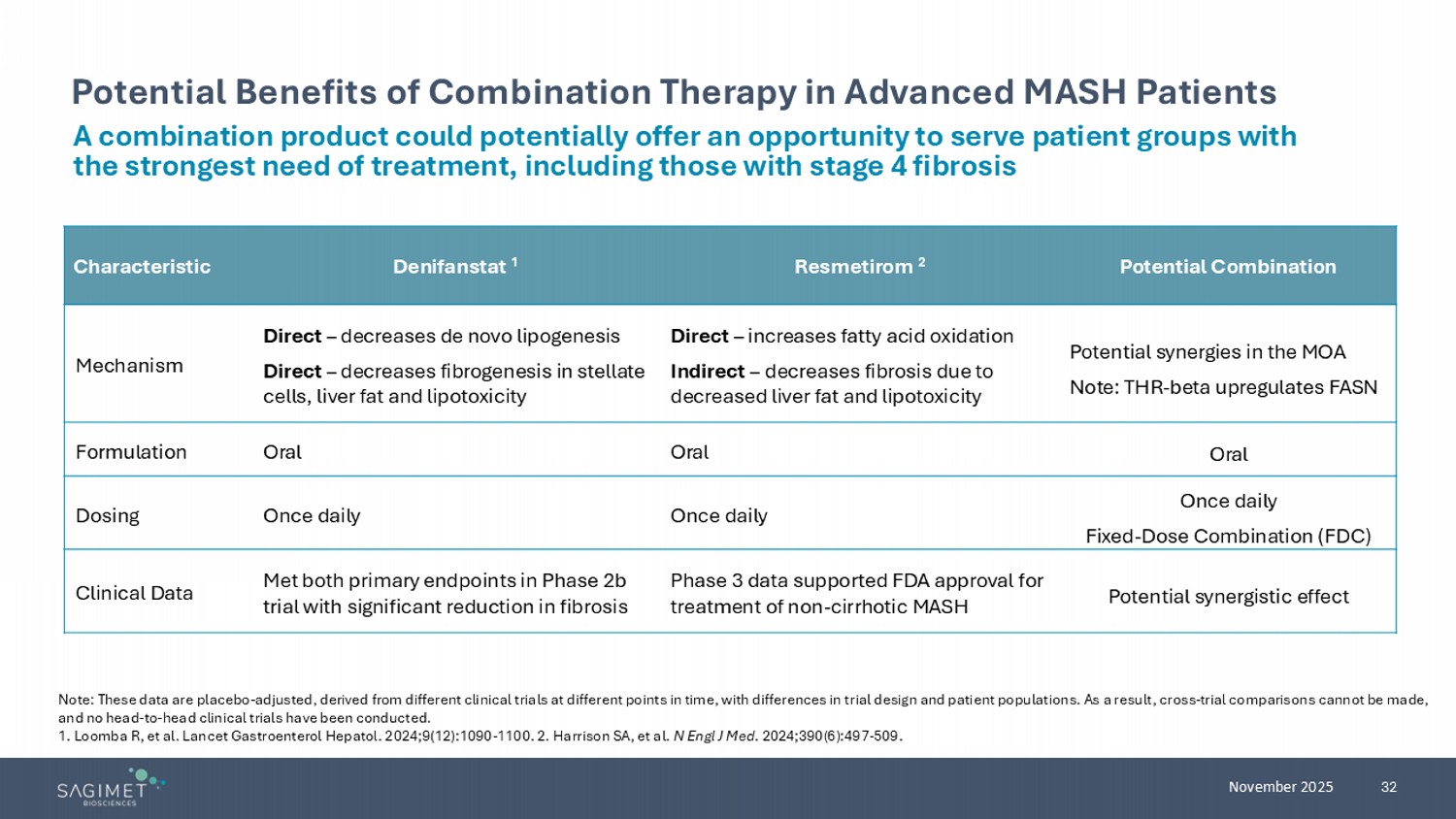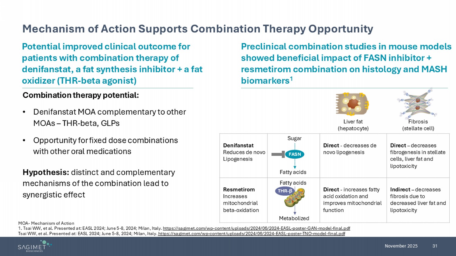 31 November 2025 Mechanism of Action Supports Combination Therapy Opportunity MOA - Mechanism of Action 1. Tsai WW, et al. Presented at: EASL 2024; June 5 - 8, 2024; Milan, Italy. https://sagimet.com/wp - content/uploads/2024/06/2024 - EASL - poster - GAN - model - final.pdf Tsai WW, et al. Presented at: EASL 2024; June 5 - 8, 2024; Milan, Italy. https://sagimet.com/wp - content/uploads/2024/06/2024 - EASL - poster - TNO - model - final.pdf Combination therapy potential: • Denifanstat MOA complementary to other MOAs – THR - beta, GLPs • Opportunity for fixed dose combinations with other oral medications Potential improved clinical outcome for patients with combination therapy of denifanstat, a fat synthesis inhibitor + a fat oxidizer (THR - beta agonist) Hypothesis: distinct and complementary mechanisms of the combination lead to synergistic effect Preclinical combination studies in mouse models showed beneficial impact of FASN inhibitor + resmetirom combination on histology and MASH biomarkers 1 Fibrosis (stellate cell) Liver fat (hepatocyte) Direct – decreases fibrogenesis in stellate cells, liver fat and lipotoxicity Direct - decreases de novo lipogenesis Denifanstat Reduces de novo Lipogenesis Indirect – decreases fibrosis due to decreased liver fat and lipotoxicity Direct - increases fatty acid oxidation and improves mitochondrial function Resmetirom Increases mitochondrial beta - oxidation FASN THR - F atty acids Metabolized Sugar Fatty acids
