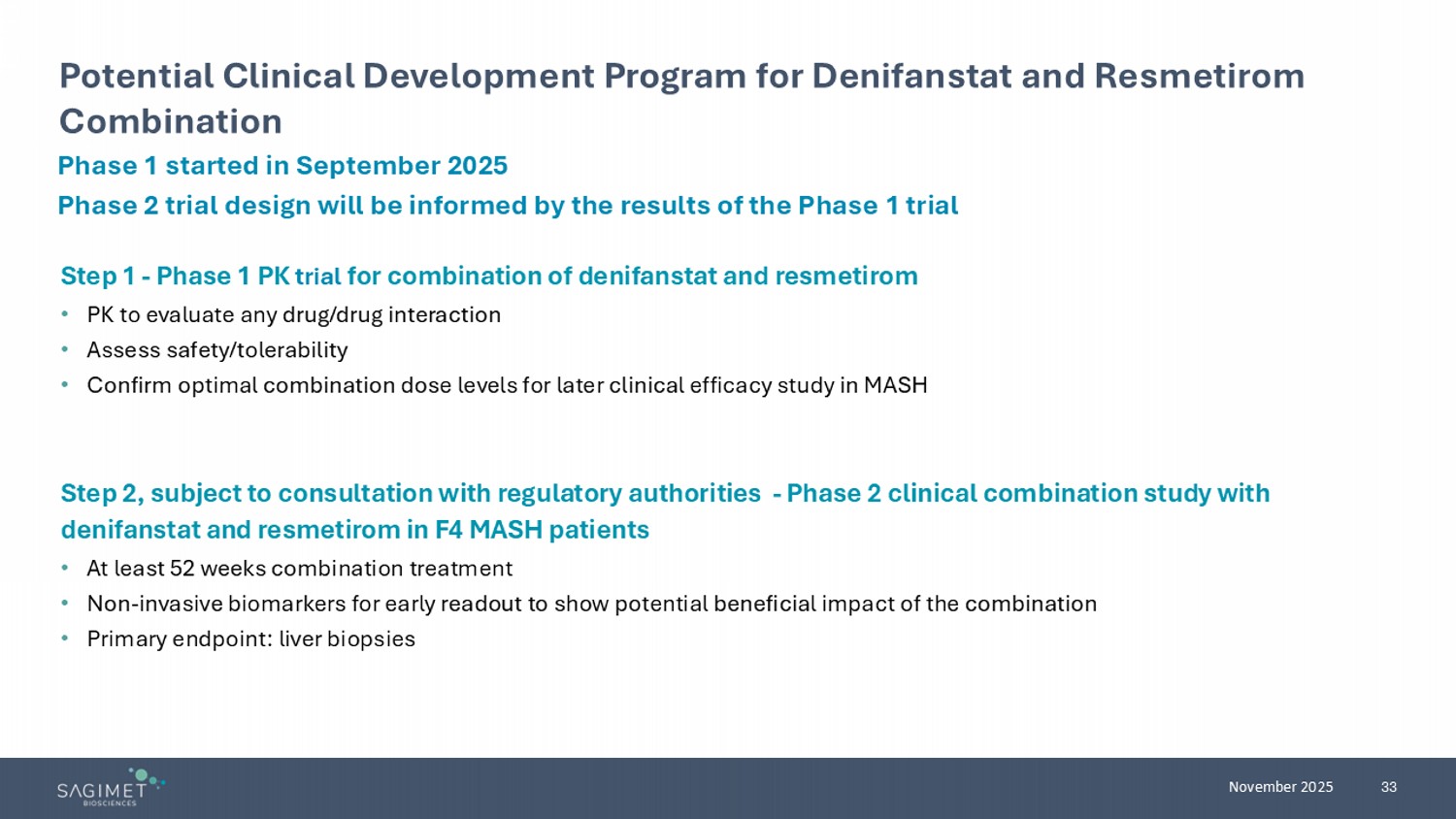 20 November 2025 Differentiated Mechanism of Action • In vitro data demonstrates that denifanstat reduces pro - fibrotic signaling in stellate cells , suggesting that denifanstat has the potential to remove fibrotic scar tissue and reestablish the basal extracellular matrix ( ECM ) scaffold even in cirrhotic (F4) patients 1 • Hepatocytes continue to be functional, and patients frequently have increased liver fat Clinical Data • PK profiles in cirrhotic (F4) patients in the Phase 1 impaired hepatic function study 3 • Positive impact on advanced fibrosis in patients in FASCINATE - 2 4 , including qF4 (quantification of fibrosis stage 4) patients based on AI - based digital pathology 5 Next Step • Potential Phase 2 proof of concept in F4 patients Denifanstat Potential in Cirrhotic (F4) Patients ~20% of Patients Progress to Cirrhosis 2 MASH MASH with fibrosis Histological features of MASH Steatosis > 5% Hepatocyte ballooning Lobular inflammation Cirrhosis 1. Kamm DR, McCommis KS. J Physiol. 2022;600(8):1825 - 1837. 2. Sheka AC, et al. JAMA. 2020;323(12):1175 - 1183 . 3. Sagimet Biosciences data on file. CLIN - 009. 4. Loomba R, et al. Lancet Gastroenterol Hepatol. 2024;9(12):1090 - 1100. 5. Sagimet Biosciences data on file. FASCINATE - 2 HistoIndex .