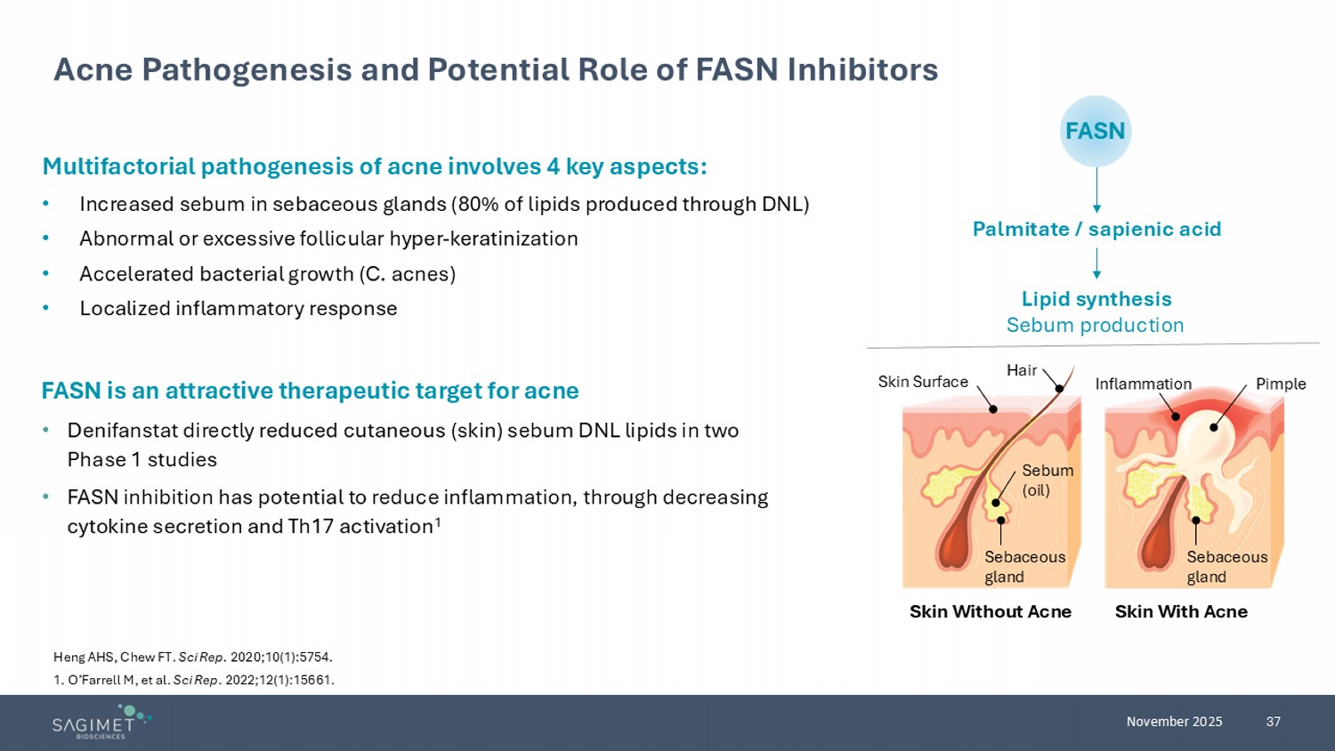 37 November 2025 Multifactorial pathogenesis of acne involves 4 key aspects: • Increased sebum in sebaceous glands (80% of lipids produced through DNL) • Abnormal or excessive follicular hyper - keratinization • Accelerated bacterial growth (C. acnes) • Localized inflammatory response Acne Pathogenesis and Potential Role of FASN Inhibitors Heng AHS, Chew FT. Sci Rep. 2020;10(1):5754. 1. O’Farrell M, et al. Sci Rep . 2022;12(1):15661. FASN Palmitate / sapienic acid Lipid synthesis Sebum production Hair Skin Surface Sebum (oil) Inflammation Sebaceous gland Skin With Acne Skin Without Acne Pimple Sebaceous gland FASN is an attractive therapeutic target for acne • Denifanstat directly reduced cutaneous (skin) sebum DNL lipids in two Phase 1 studies • FASN inhibition has potential to reduce inflammation, through decreasing cytokine secretion and Th17 activation 1