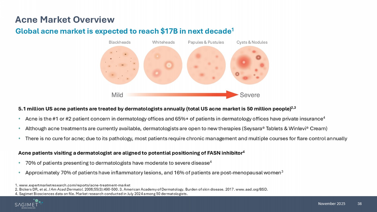 38 November 2025 Blackheads Whiteheads Papules & Pustules Cysts & Nodules Acne Market Overview Global acne market is expected to reach $17B in next decade 1 5.1 million US acne patients are treated by dermatologists annually (total US acne market is 50 million people ) 2,3 • Acne is the #1 or #2 patient concern in dermatology offices and 65%+ of patients in dermatology offices have private insurance 4 • Although acne treatments are currently available, d ermatologists are open to new therapies ( Seysara ® Tablets & Winlevi ® Cream) • T here is no cure for acne ; due to its pathology, most patients require chronic management and multiple courses for flare control annually Acne patients visiting a dermatologist are aligned to potential positioning of FASN inhibitor 4 • 70 % of patients presenting to dermatologists have moderate to severe disease 4 • Approximately 70% of patients have inflammatory lesions, and 16% of patients are post - menopausal women 3 1. www.expertmarketresearch.com/reports/acne - treatment - market 2. Bickers DR, et al. J Am Acad Dermatol . 2006;55(3):490 - 500. 3. American Academy of Dermatology. Burden of skin disease. 2017. www.aad.org/BSD. 4. Sagimet Biosciences data on file. Market research conducted in July 2024 among 50 dermatologists.