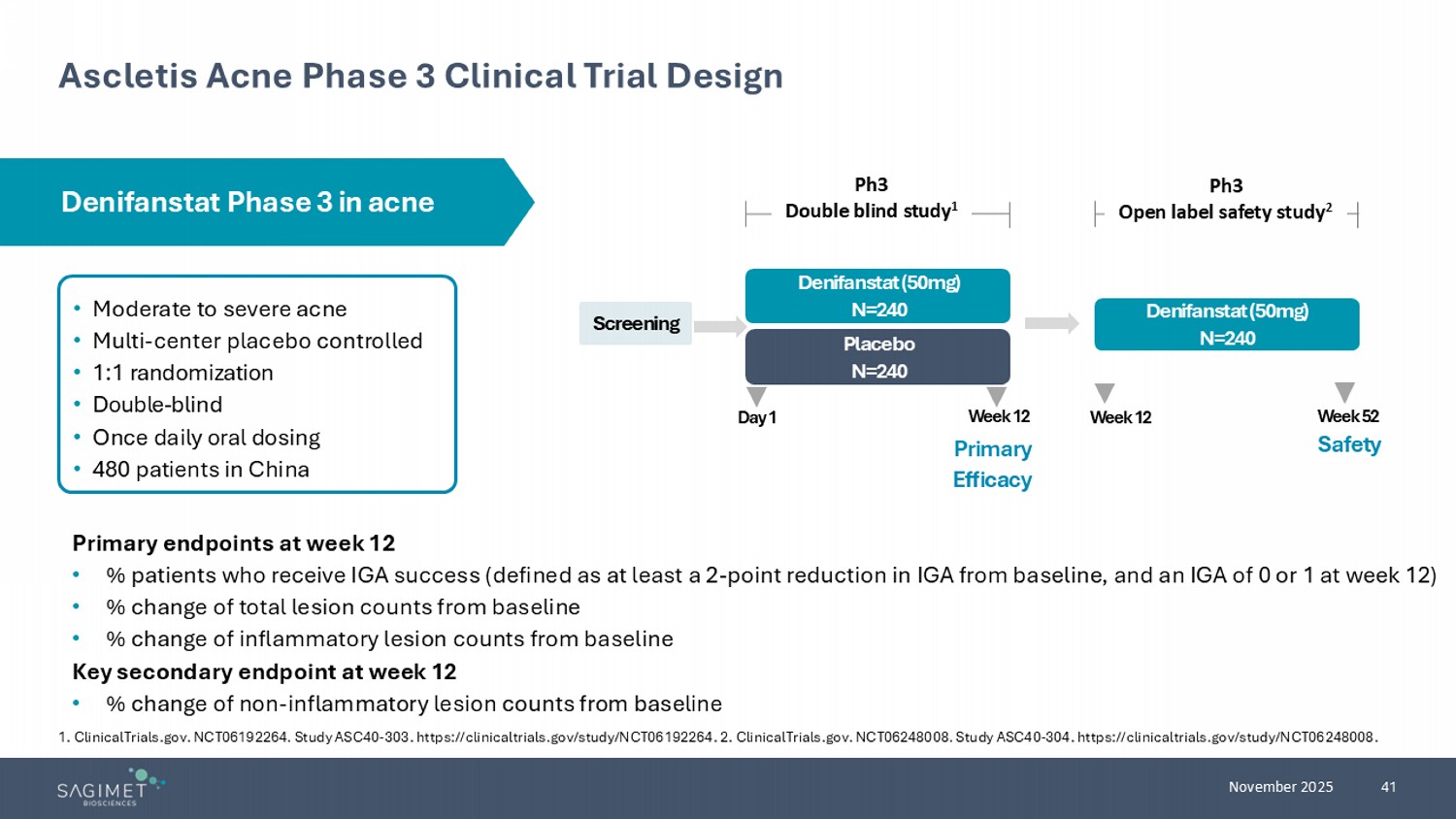 40 November 2025 Clinical Data Support Mechanism of Action of a FASN Inhibitor in Acne • FASN inhibitor demonstrated a >90% reduction in sebum lipids by day 15 1,2 • FASN inhibitor maintained the reduced level of sebum lipids through the entire study 1,2 • FASN inhibitor demonstrated a dose responsive impact on sebum lipids 1,2 Note: denifanstat dose in this Phase 1 trial in cancer patients is several times higher than 50 mg dose tested in acne and MASH I n multiple Phase 1 trials, FASN inhibitor demonstrated a decrease in DNL sebum lipids 1 - 3 1. Duke G, et al. Presented at: EASL 2017; April 19 - 23, 2017; Amsterdam, The Netherlands. https://sagimet.com/wp - content/uploads/2017/05/3VBIO_EASLposter.pdf. 2. Falchook G, et al. EClinicalMedicine . 2021;34:100797. 3. Duke G, et al. Presented at: AASLD 2016; November 11 - 15, 2016; Boston, MA. https://sagimet.com/wp - content/uploads/2016/11/2016_AASLD_FASN_NASH_36x60_v10.pdf. Days on therapy (# of subjects) Phase 1 oncology trial Sebutape® assessment of cutaneous sebum lipids 1,2