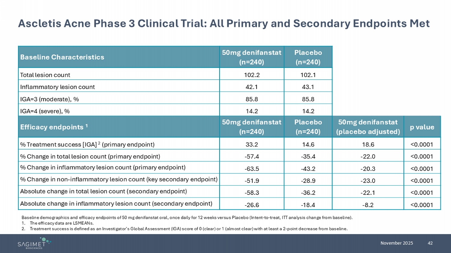 41 November 2025 Ascletis Acne Phase 3 Clinical Trial Design • Moderate to severe acne • Multi - center placebo controlled • 1 :1 randomization • D ouble - blind • Once daily oral dosing • 480 patients in China Primary endpoints at week 12 • % patients who receive IGA success (defined as at least a 2 - point reduction in IGA from baseline, and an IGA of 0 or 1 at week 1 2) • % change of total lesion counts from baseline • % change of inflammatory lesion counts from baseline Key secondary endpoint at week 12 • % change of non - inflammatory lesion counts from baseline Screening Placebo N=240 Denifanstat (50mg) N=240 Day 1 Week 12 Primary Efficacy Denifanstat (50mg) N=240 Safety Ph3 Double blind study 1 Ph3 Open label safety study 2 Week 12 Week 52 Denifanstat Phase 3 in acne 1. ClinicalTrials.gov. NCT06192264. Study ASC40 - 303. https://clinicaltrials.gov/study/NCT06192264. 2. ClinicalTrials.gov. NCT062 48008. Study ASC40 - 304. https://clinicaltrials.gov/study/NCT06248008.
