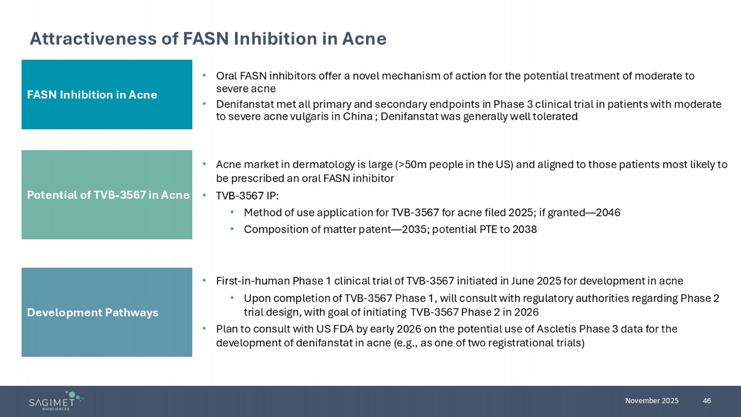 44 November 2025 A double - blind, randomized, placebo - controlled trial to assess the safety, tolerability, pharmacokinetics and pharmacodynamics of single and multiple ascending doses of TVB - 3567 in healthy and acne participants • Includes sebum analysis as pharmacodynamic readout Note: SAD = Single ascending dose. MAD = Multiple ascending dose Each SAD/MAD cohort planned to include 6 participants on active and 2 on placebo. * Lipidomic analysis with focus on FASN - derived lipids. ClinicalTrials.gov. NCT06989840. Study SB3567 - CLIN - 001. https://clinicaltrials.gov/study/NCT06989840. Phase 1 clinical trial initiated June 2025 Second FASN Inhibitor TVB - 3567 Entered FIH Phase 1 Sebutape Sebumeter Quantity of Sebum Quality* of Sebum PLANNED # of PARTICIPANTS DESIGN PART ~56 SAD A ~12 Food effect B ~32 MAD C ~28 MAD/ACNE D