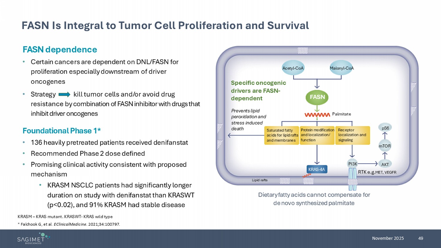 49 November 2025 FASN Is Integral to Tumor Cell Proliferation and Surviv al KRASM – KRAS mutant. KRASWT - KRAS wild type FASN dependence • Certain cancers are dependent on DNL/FASN for proliferation especially downstream of driver oncogenes • Strategy kill tumor cells and/or avoid drug resistance by combination of FASN inhibitor with drugs that inhibit driver oncogenes Dietary fatty acids cannot compensate for de novo synthesized palmitate Specific oncogenic drivers are FASN - dependent Prevents lipid peroxidation and stress induced death Palmitate RTK e.g. MET , VEGFR Saturated fatty acids for lipid rafts and membranes Protein modification and localization/ function Receptor localization and signaling Acetyl - CoA Malonyl - CoA pS6 mTOR AKT PI3K KRAS - 4A Lipid rafts FASN Foundational Phase 1* • 136 heavily pretreated patients received denifanstat • Recommended Phase 2 dose defined • Promising clinical activity consistent with proposed mechanism • KRASM NSCLC patients had significantly longer duration on study with denifanstat than KRASWT (p<0.02), and 91% KRASM had stable disease * Falchook G, et al. EClinicalMedicine . 2021;34:100797.