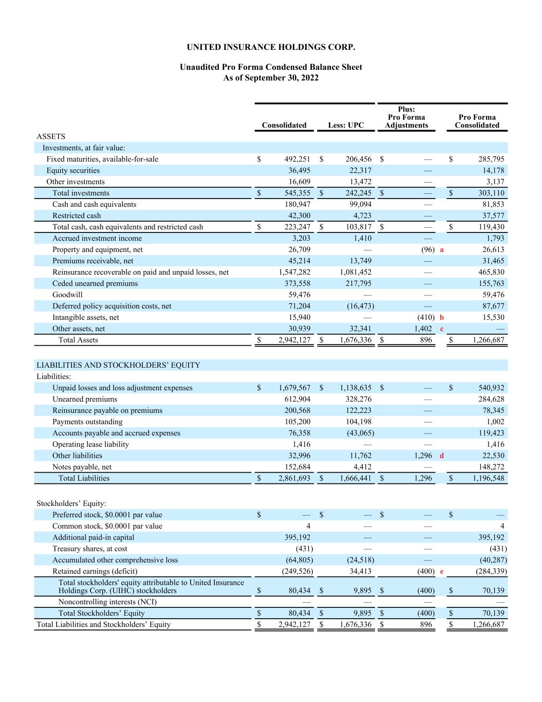 Unaudited Pro Forma Condensed Balance Sheet As of September 30, 2022 Consolidated Less: UPC Plus: Pro Forma Adjustments Pro Forma Consolidated ASSETS Investments, at fair value: Fixed maturities, available-for-sale $ 492,251 $ 206,456 $ — $ 285,795 Equity securities 36,495 22,317 — 14,178 Other investments 16,609 13,472 — 3,137 Total investments $ 545,355 $ 242,245 $ — $ 303,110 Cash and cash equivalents 180,947 99,094 — 81,853 Restricted cash 42,300 4,723 — 37,577 Total cash, cash equivalents and restricted cash $ 223,247 $ 103,817 $ — $ 119,430 Accrued investment income 3,203 1,410 — 1,793 Property and equipment, net 26,709 — (96) a 26,613 Premiums receivable, net 45,214 13,749 — 31,465 Reinsurance recoverable on paid and unpaid losses, net 1,547,282 1,081,452 — 465,830 Ceded unearned premiums 373,558 217,795 — 155,763 Goodwill 59,476 — — 59,476 Deferred policy acquisition costs, net 71,204 (16,473) — 87,677 Intangible assets, net 15,940 — (410) b 15,530 Other assets, net 30,939 32,341 1,402 c — Total Assets $ 2,942,127 $ 1,676,336 $ 896 $ 1,266,687 LIABILITIES AND STOCKHOLDERS’ EQUITY Liabilities: Unpaid losses and loss adjustment expenses $ 1,679,567 $ 1,138,635 $ — $ 540,932 Unearned premiums 612,904 328,276 — 284,628 Reinsurance payable on premiums 200,568 122,223 — 78,345 Payments outstanding 105,200 104,198 — 1,002 Accounts payable and accrued expenses 76,358 (43,065) — 119,423 Operating lease liability 1,416 — — 1,416 Other liabilities 32,996 11,762 1,296 d 22,530 Notes payable, net 152,684 4,412 — 148,272 Total Liabilities $ 2,861,693 $ 1,666,441 $ 1,296 $ 1,196,548 Stockholders’ Equity: Preferred stock, $0.0001 par value $ — $ — $ — $ — Common stock, $0.0001 par value 4 — — 4 Additional paid-in capital 395,192 — — 395,192 Treasury shares, at cost (431) — — (431) Accumulated other comprehensive loss (64,805) (24,518) — (40,287) Retained earnings (deficit) (249,526) 34,413 (400) e (284,339) Total stockholders' equity attributable to United Insurance Holdings Corp. (UIHC) stockholders $ 80,434 $ 9,895 $ (400) $ 70,139 Noncontrolling interests (NCI) — — — — Total Stockholders’ Equity $ 80,434 $ 9,895 $ (400) $ 70,139 Total Liabilities and Stockholders’ Equity $ 2,942,127 $ 1,676,336 $ 896 $ 1,266,687 UNITED INSURANCE HOLDINGS CORP.