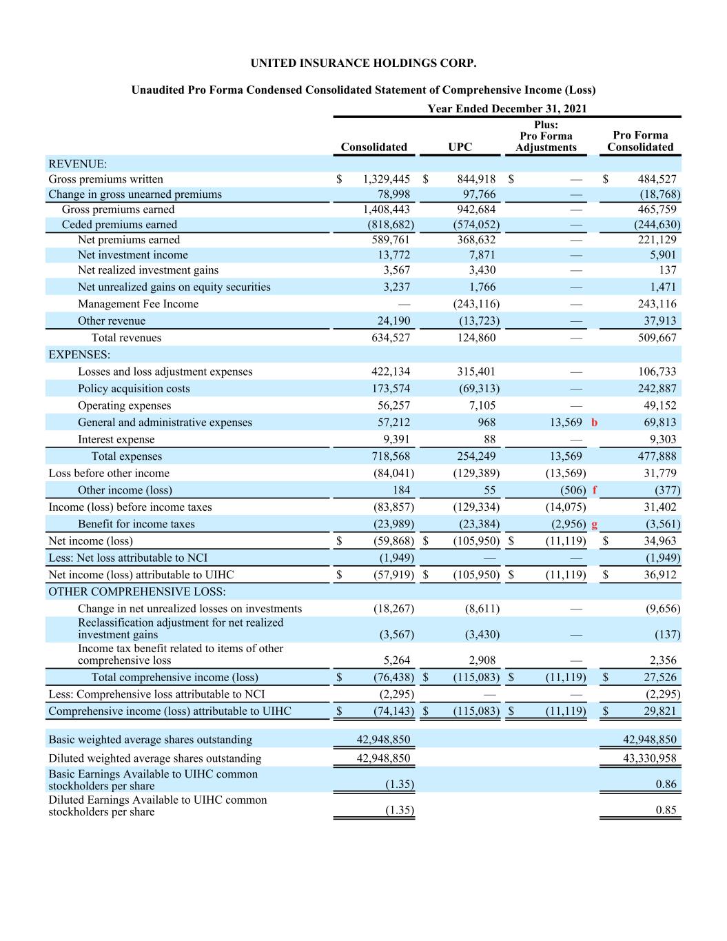 Unaudited Pro Forma Condensed Consolidated Statement of Comprehensive Income (Loss) Year Ended December 31, 2021 Consolidated UPC Plus: Pro Forma Adjustments Pro Forma Consolidated REVENUE: Gross premiums written $ 1,329,445 $ 844,918 $ — $ 484,527 Change in gross unearned premiums 78,998 97,766 — (18,768) Gross premiums earned 1,408,443 942,684 — 465,759 Ceded premiums earned (818,682) (574,052) — (244,630) Net premiums earned 589,761 368,632 — 221,129 Net investment income 13,772 7,871 — 5,901 Net realized investment gains 3,567 3,430 — 137 Net unrealized gains on equity securities 3,237 1,766 — 1,471 Management Fee Income — (243,116) — 243,116 Other revenue 24,190 (13,723) — 37,913 Total revenues 634,527 124,860 — 509,667 EXPENSES: Losses and loss adjustment expenses 422,134 315,401 — 106,733 Policy acquisition costs 173,574 (69,313) — 242,887 Operating expenses 56,257 7,105 — 49,152 General and administrative expenses 57,212 968 13,569 b 69,813 Interest expense 9,391 88 — 9,303 Total expenses 718,568 254,249 13,569 477,888 Loss before other income (84,041) (129,389) (13,569) 31,779 Other income (loss) 184 55 (506) f (377) Income (loss) before income taxes (83,857) (129,334) (14,075) 31,402 Benefit for income taxes (23,989) (23,384) (2,956) g (3,561) Net income (loss) $ (59,868) $ (105,950) $ (11,119) $ 34,963 Less: Net loss attributable to NCI (1,949) — — (1,949) Net income (loss) attributable to UIHC $ (57,919) $ (105,950) $ (11,119) $ 36,912 OTHER COMPREHENSIVE LOSS: Change in net unrealized losses on investments (18,267) (8,611) — (9,656) Reclassification adjustment for net realized investment gains (3,567) (3,430) — (137) Income tax benefit related to items of other comprehensive loss 5,264 2,908 — 2,356 Total comprehensive income (loss) $ (76,438) $ (115,083) $ (11,119) $ 27,526 Less: Comprehensive loss attributable to NCI (2,295) — — (2,295) Comprehensive income (loss) attributable to UIHC $ (74,143) $ (115,083) $ (11,119) $ 29,821 Basic weighted average shares outstanding 42,948,850 42,948,850 Diluted weighted average shares outstanding 42,948,850 43,330,958 Basic Earnings Available to UIHC common stockholders per share (1.35) 0.86 Diluted Earnings Available to UIHC common stockholders per share (1.35) 0.85 UNITED INSURANCE HOLDINGS CORP.