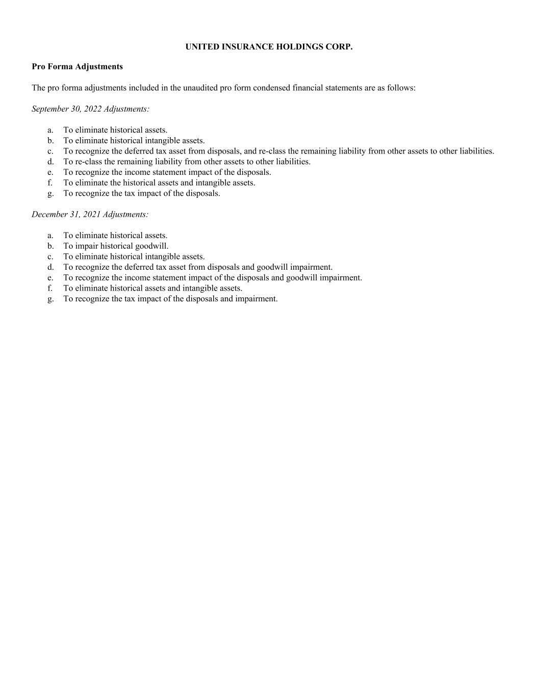 Pro Forma Adjustments The pro forma adjustments included in the unaudited pro form condensed financial statements are as follows: September 30, 2022 Adjustments: a. To eliminate historical assets. b. To eliminate historical intangible assets. c. To recognize the deferred tax asset from disposals, and re-class the remaining liability from other assets to other liabilities. d. To re-class the remaining liability from other assets to other liabilities. e. To recognize the income statement impact of the disposals. f. To eliminate the historical assets and intangible assets. g. To recognize the tax impact of the disposals. December 31, 2021 Adjustments: a. To eliminate historical assets. b. To impair historical goodwill. c. To eliminate historical intangible assets. d. To recognize the deferred tax asset from disposals and goodwill impairment. e. To recognize the income statement impact of the disposals and goodwill impairment. f. To eliminate historical assets and intangible assets. g. To recognize the tax impact of the disposals and impairment. UNITED INSURANCE HOLDINGS CORP.