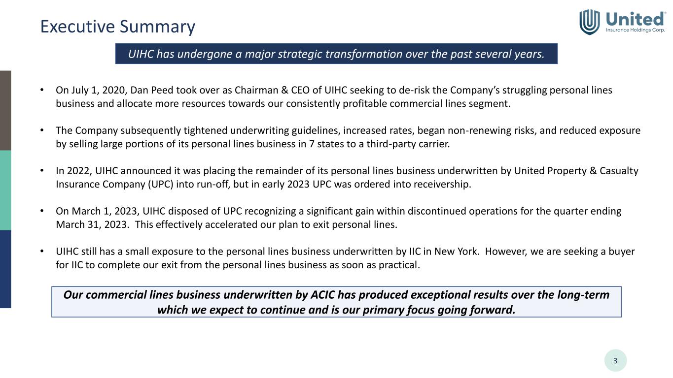 Company Overview 2 UIHC is a specialty underwriter of catastrophe exposed property insurance. United Insurance Holding Corp. (Nasdaq: UIHC) was founded in 1999 and is the insurance holding company for two P&C carriers: American Coastal Insurance Company (ACIC) and Interboro Insurance Company (IIC) along with other operating affiliates. ACIC has the #1 market share of commercial residential property insurance for condominium associations (commercial lines) in Florida with roughly 5,100 policies and $563 million of premium in-force. IIC’s homeowners & fire insurance products (personal lines) are written exclusively in New York with roughly 18,000 policies and $31 million of premium in-force. UIHC as of March 31, 2023 Total Assets: $1.4 billion Total Equity: $83.5 million Annualized Revenue: $416.2 million Employees: 110 Headquarters: St. Petersburg, FL Credit Rating: BB+ (Kroll) Specialty Commercial Property Specialty Homeowners For more information on UIHC please visit: investors.amcoastal.com
