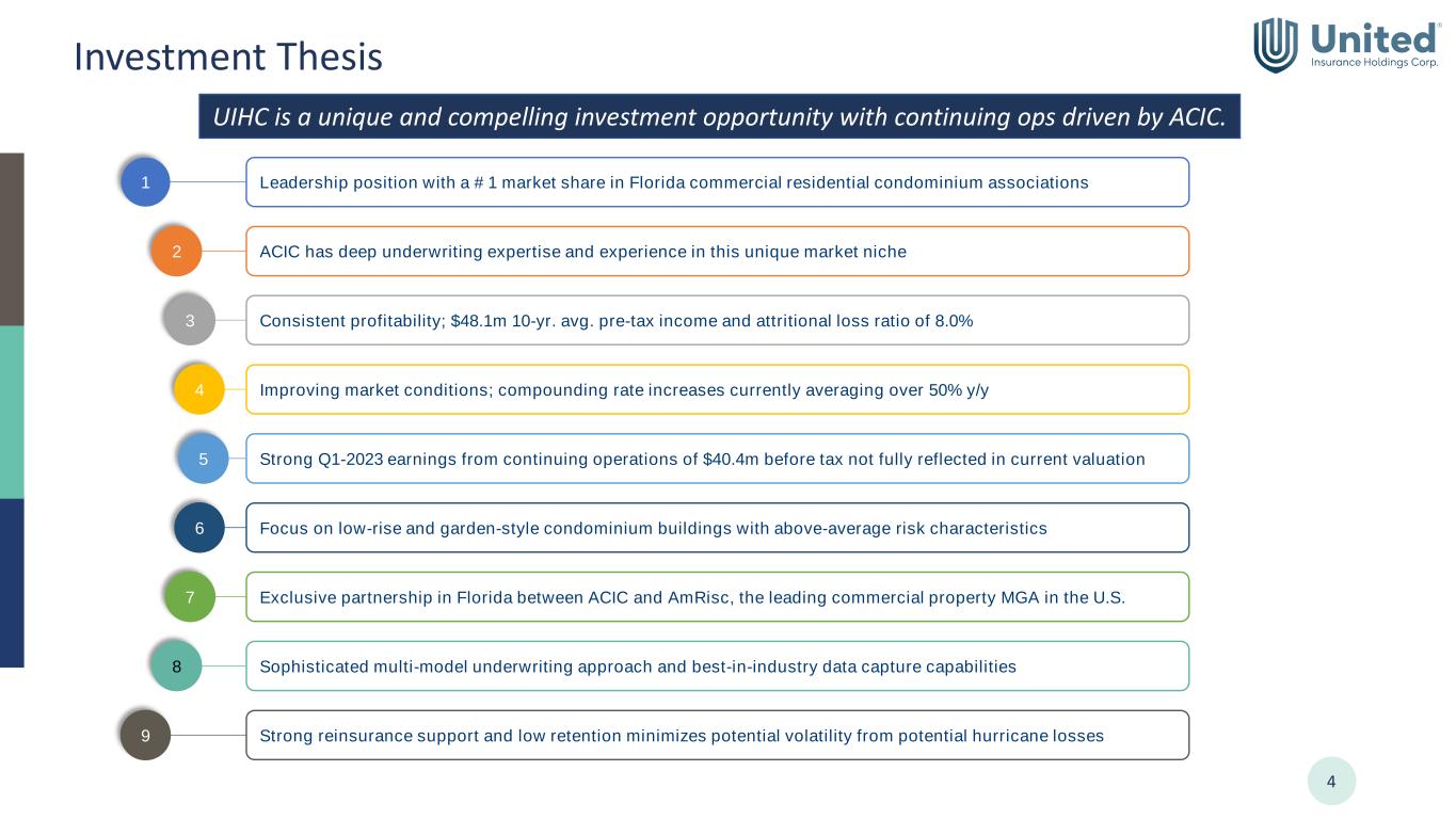 3 Executive Summary • On July 1, 2020, Dan Peed took over as Chairman & CEO of UIHC seeking to de-risk the Company’s struggling personal lines business and allocate more resources towards our consistently profitable commercial lines segment. • The Company subsequently tightened underwriting guidelines, increased rates, began non-renewing risks, and reduced exposure by selling large portions of its personal lines business in 7 states to a third-party carrier. • In 2022, UIHC announced it was placing the remainder of its personal lines business underwritten by United Property & Casualty Insurance Company (UPC) into run-off, but in early 2023 UPC was ordered into receivership. • On March 1, 2023, UIHC disposed of UPC recognizing a significant gain within discontinued operations for the quarter ending March 31, 2023. This effectively accelerated our plan to exit personal lines. • UIHC still has a small exposure to the personal lines business underwritten by IIC in New York. However, we are seeking a buyer for IIC to complete our exit from the personal lines business as soon as practical. UIHC has undergone a major strategic transformation over the past several years. Our commercial lines business underwritten by ACIC has produced exceptional results over the long-term which we expect to continue and is our primary focus going forward.