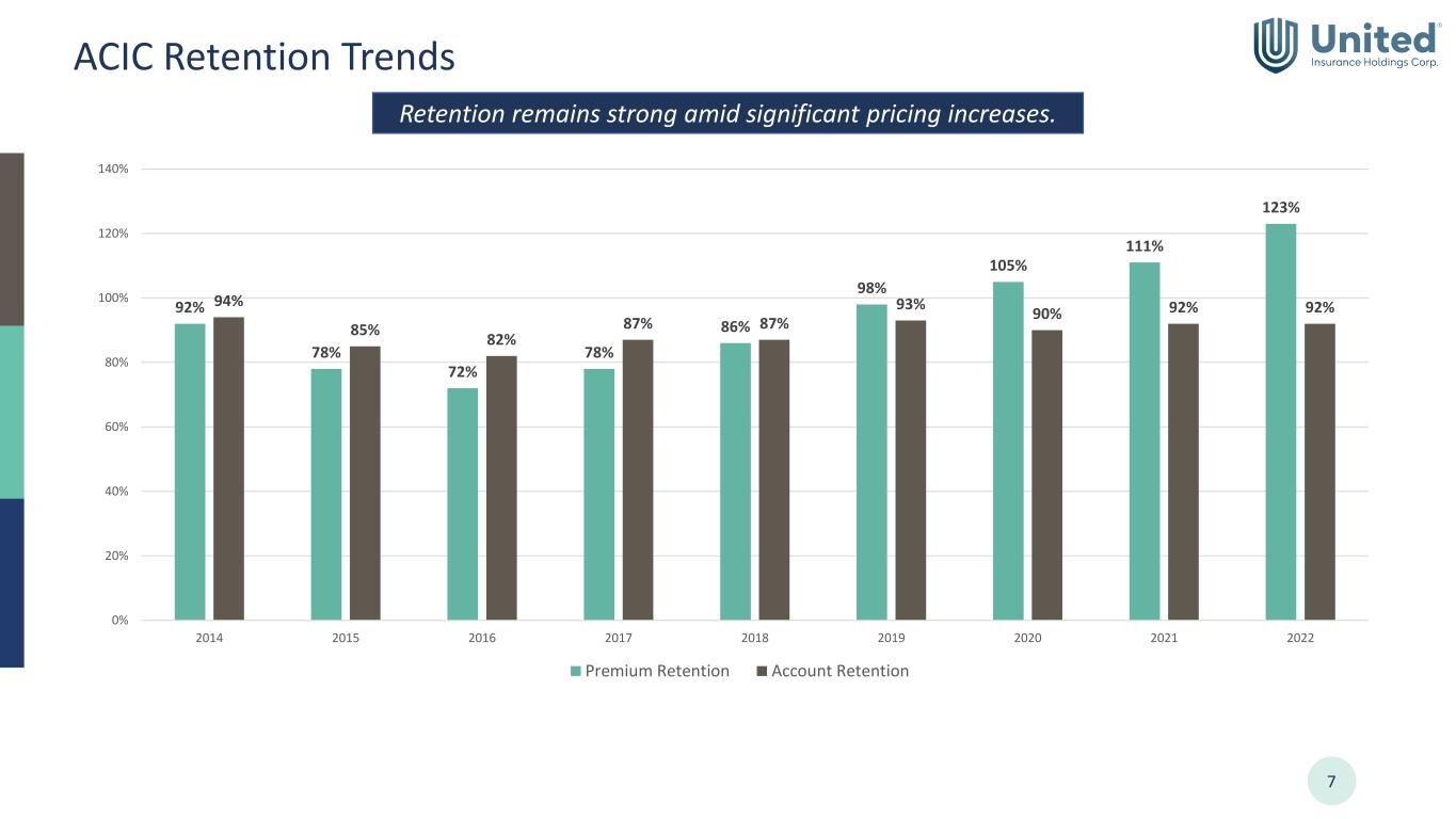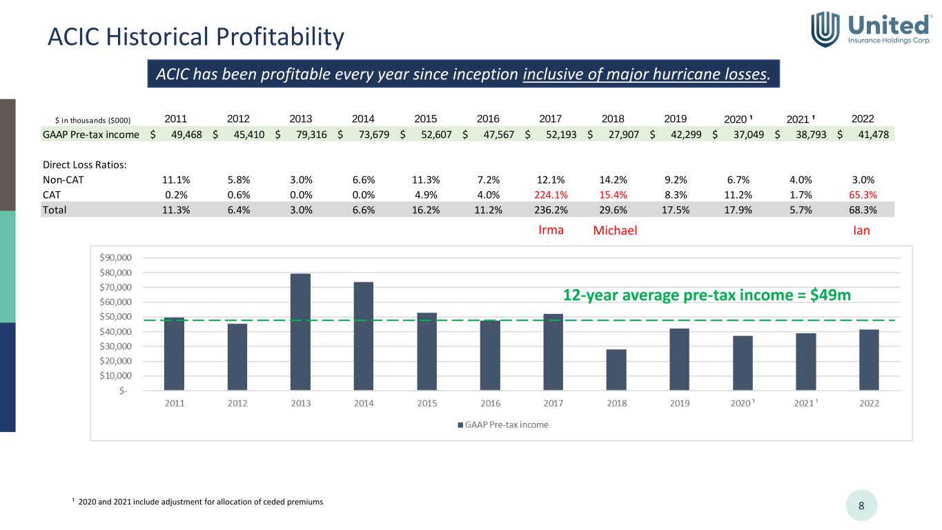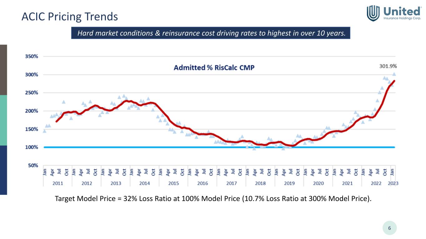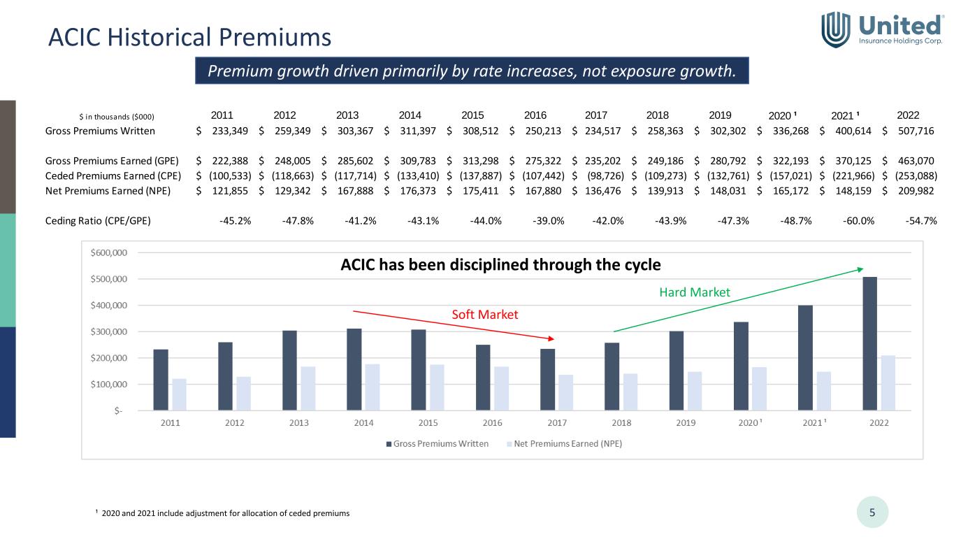 Investment Thesis 4 1 Leadership position with a # 1 market share in Florida commercial residential condominium associations 6 Focus on low-rise and garden-style condominium buildings with above-average risk characteristics 7 Exclusive partnership in Florida between ACIC and AmRisc, the leading commercial property MGA in the U.S. 8 Sophisticated multi-model underwriting approach and best-in-industry data capture capabilities 3 Consistent profitability; $48.1m 10-yr. avg. pre-tax income and attritional loss ratio of 8.0% 4 Improving market conditions; compounding rate increases currently averaging over 50% y/y 5 Strong Q1-2023 earnings from continuing operations of $40.4m before tax not fully reflected in current valuation 9 Strong reinsurance support and low retention minimizes potential volatility from potential hurricane losses 2 ACIC has deep underwriting expertise and experience in this unique market niche UIHC is a unique and compelling investment opportunity with continuing ops driven by ACIC.