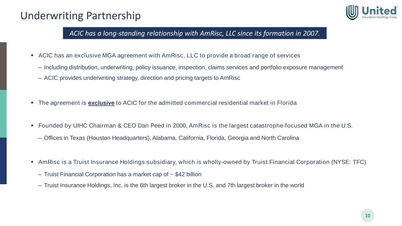 Underwriting Strategy 9 Focus in on habitational commercial residential property in Florida. ▪ Admitted Lines: Florida ▪ Target Risks: Low-rise, garden-style condominiums ▪ Geographical Specialty: State of Florida ▪ Target Total Insured Value: Up to $75m ▪ Minimum Deductible: $1,000 - $10,000 AOP, 3%-5% named storm wind / hail depending on location ▪ Minimum Account Premium: $10,000 - $25,000 depending on location ▪ Pricing: High degree of flexibility
