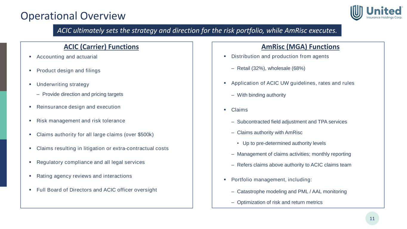 Underwriting Partnership 10 ACIC has a long-standing relationship with AmRisc, LLC since its formation in 2007. ▪ ACIC has an exclusive MGA agreement with AmRisc, LLC to provide a broad range of services – Including distribution, underwriting, policy issuance, inspection, claims services and portfolio exposure management – ACIC provides underwriting strategy, direction and pricing targets to AmRisc ▪ The agreement is exclusive to ACIC for the admitted commercial residential market in Florida ▪ Founded by UIHC Chairman & CEO Dan Peed in 2000, AmRisc is the largest catastrophe-focused MGA in the U.S. – Offices in Texas (Houston Headquarters), Alabama, California, Florida, Georgia and North Carolina ▪ AmRisc is a Truist Insurance Holdings subsidiary, which is wholly-owned by Truist Financial Corporation (NYSE: TFC) – Truist Financial Corporation has a market cap of ~ $42 billion – Truist Insurance Holdings, Inc. is the 6th largest broker in the U.S. and 7th largest broker in the world