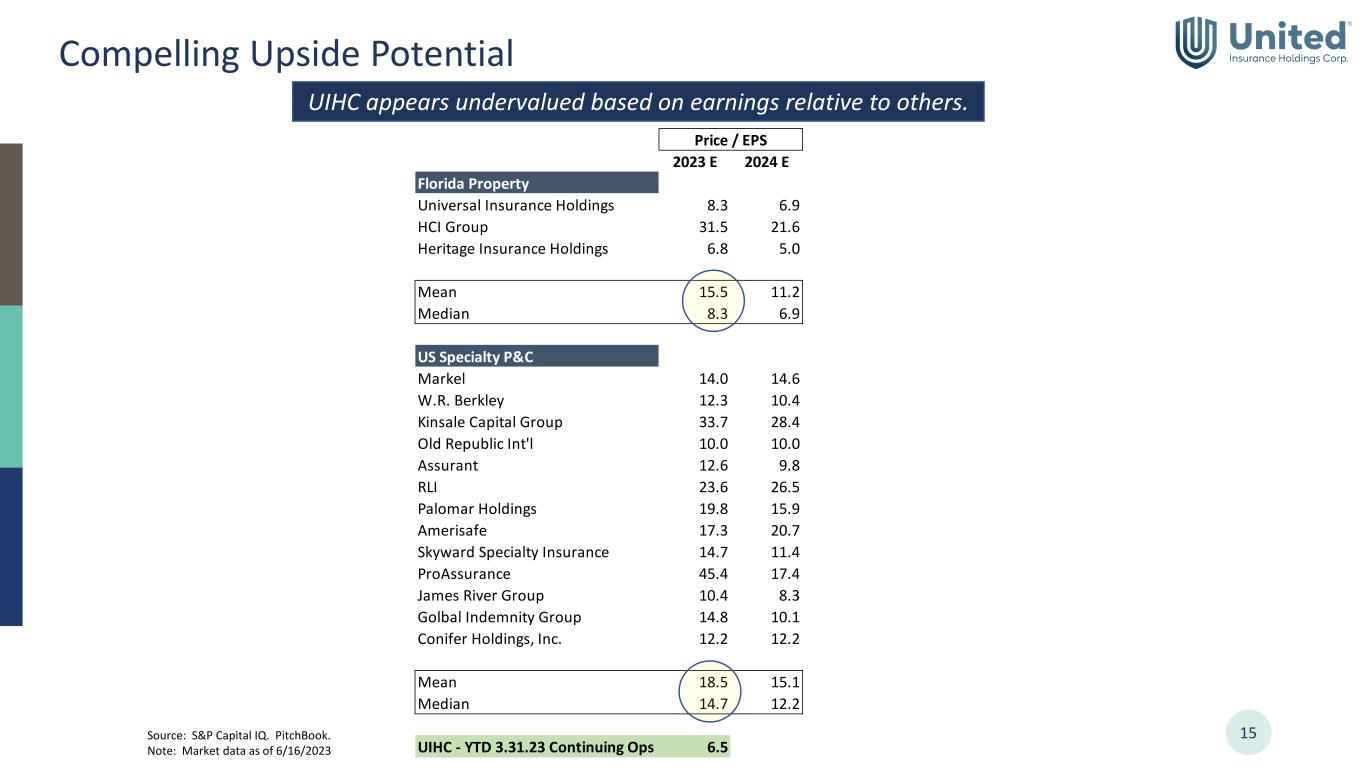Compelling Upside Potential 15 UIHC appears undervalued based on earnings relative to others. Source: S&P Capital IQ. PitchBook. Note: Market data as of 6/16/2023 2023 E 2024 E Florida Property Universal Insurance Holdings 8.3 6.9 HCI Group 31.5 21.6 Heritage Insurance Holdings 6.8 5.0 Mean 15.5 11.2 Median 8.3 6.9 US Specialty P&C Markel 14.0 14.6 W.R. Berkley 12.3 10.4 Kinsale Capital Group 33.7 28.4 Old Republic Int'l 10.0 10.0 Assurant 12.6 9.8 RLI 23.6 26.5 Palomar Holdings 19.8 15.9 Amerisafe 17.3 20.7 Skyward Specialty Insurance 14.7 11.4 ProAssurance 45.4 17.4 James River Group 10.4 8.3 Golbal Indemnity Group 14.8 10.1 Conifer Holdings, Inc. 12.2 12.2 Mean 18.5 15.1 Median 14.7 12.2 UIHC - YTD 3.31.23 Continuing Ops 6.5 Price / EPS