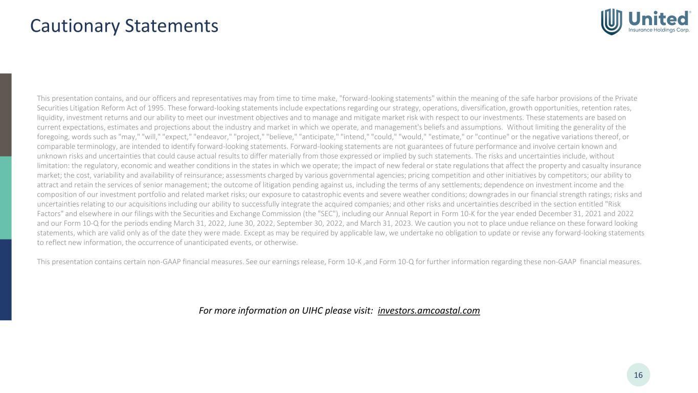 Cautionary Statements 16 This presentation contains, and our officers and representatives may from time to time make, "forward-looking statements" within the meaning of the safe harbor provisions of the Private Securities Litigation Reform Act of 1995. These forward-looking statements include expectations regarding our strategy, operations, diversification, growth opportunities, retention rates, liquidity, investment returns and our ability to meet our investment objectives and to manage and mitigate market risk with respect to our investments. These statements are based on current expectations, estimates and projections about the industry and market in which we operate, and management's beliefs and assumptions. Without limiting the generality of the foregoing, words such as "may," "will," "expect," "endeavor," "project," "believe," "anticipate," "intend," "could," "would," "estimate," or "continue" or the negative variations thereof, or comparable terminology, are intended to identify forward-looking statements. Forward-looking statements are not guarantees of future performance and involve certain known and unknown risks and uncertainties that could cause actual results to differ materially from those expressed or implied by such statements. The risks and uncertainties include, without limitation: the regulatory, economic and weather conditions in the states in which we operate; the impact of new federal or state regulations that affect the property and casualty insurance market; the cost, variability and availability of reinsurance; assessments charged by various governmental agencies; pricing competition and other initiatives by competitors; our ability to attract and retain the services of senior management; the outcome of litigation pending against us, including the terms of any settlements; dependence on investment income and the composition of our investment portfolio and related market risks; our exposure to catastrophic events and severe weather conditions; downgrades in our financial strength ratings; risks and uncertainties relating to our acquisitions including our ability to successfully integrate the acquired companies; and other risks and uncertainties described in the section entitled "Risk Factors" and elsewhere in our filings with the Securities and Exchange Commission (the "SEC"), including our Annual Report in Form 10-K for the year ended December 31, 2021 and 2022 and our Form 10-Q for the periods ending March 31, 2022, June 30, 2022, September 30, 2022, and March 31, 2023. We caution you not to place undue reliance on these forward looking statements, which are valid only as of the date they were made. Except as may be required by applicable law, we undertake no obligation to update or revise any forward-looking statements to reflect new information, the occurrence of unanticipated events, or otherwise. This presentation contains certain non-GAAP financial measures. See our earnings release, Form 10-K ,and Form 10-Q for further information regarding these non-GAAP financial measures. For more information on UIHC please visit: investors.amcoastal.com