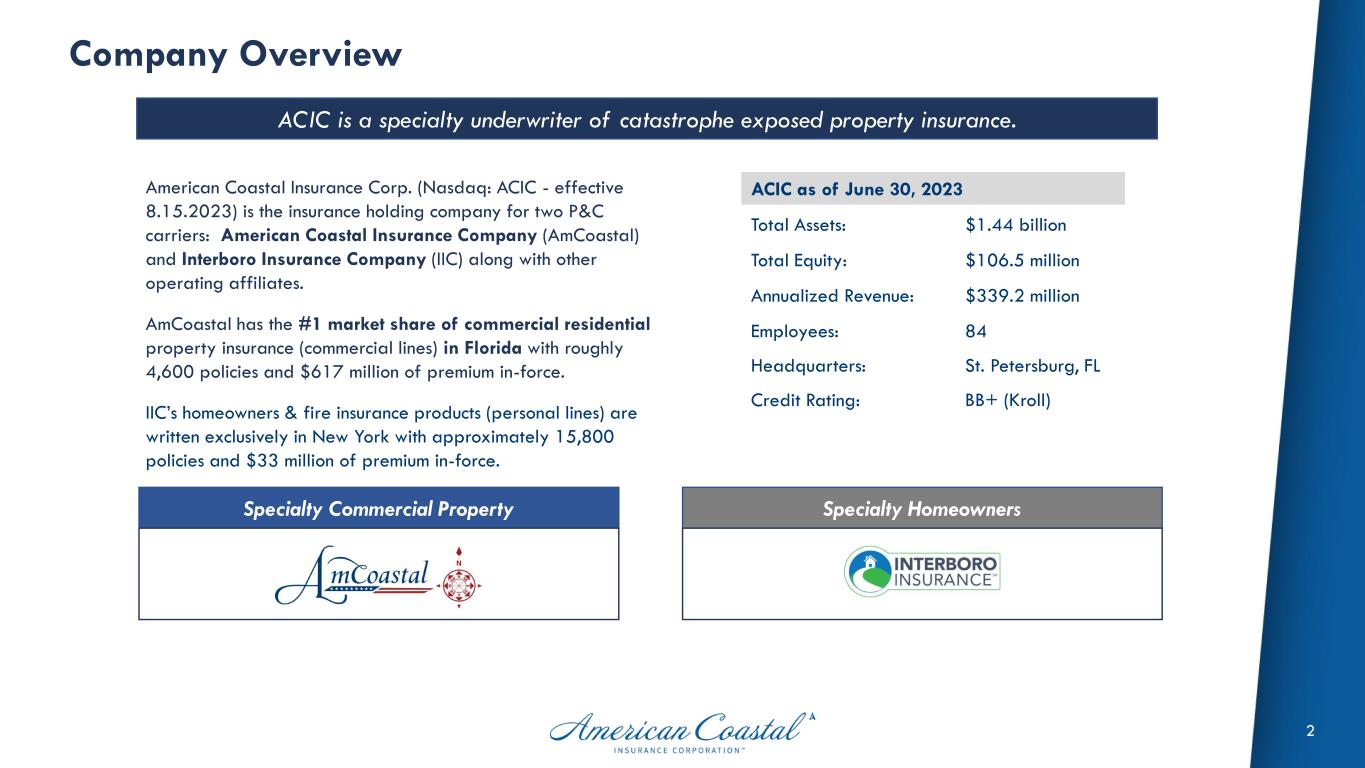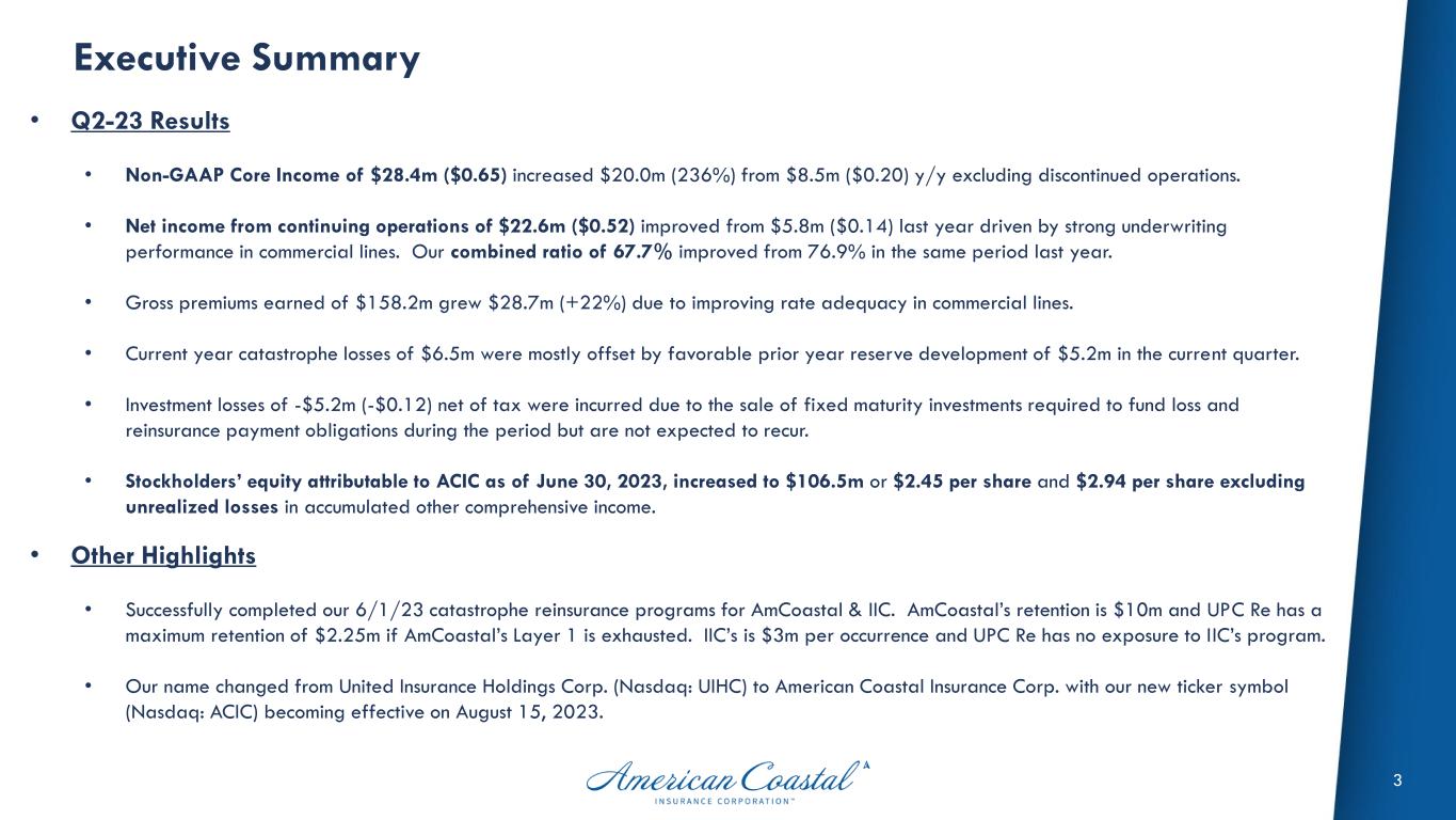 2 Company Overview ACIC is a specialty underwriter of catastrophe exposed property insurance. American Coastal Insurance Corp. (Nasdaq: ACIC - effective 8.15.2023) is the insurance holding company for two P&C carriers: American Coastal Insurance Company (AmCoastal) and Interboro Insurance Company (IIC) along with other operating affiliates. AmCoastal has the #1 market share of commercial residential property insurance (commercial lines) in Florida with roughly 4,600 policies and $617 million of premium in-force. IIC’s homeowners & fire insurance products (personal lines) are written exclusively in New York with approximately 15,800 policies and $33 million of premium in-force. ACIC as of June 30, 2023 Total Assets: $1.44 billion Total Equity: $106.5 million Annualized Revenue: $339.2 million Employees: 84 Headquarters: St. Petersburg, FL Credit Rating: BB+ (Kroll) Specialty Commercial Property Specialty Homeowners
