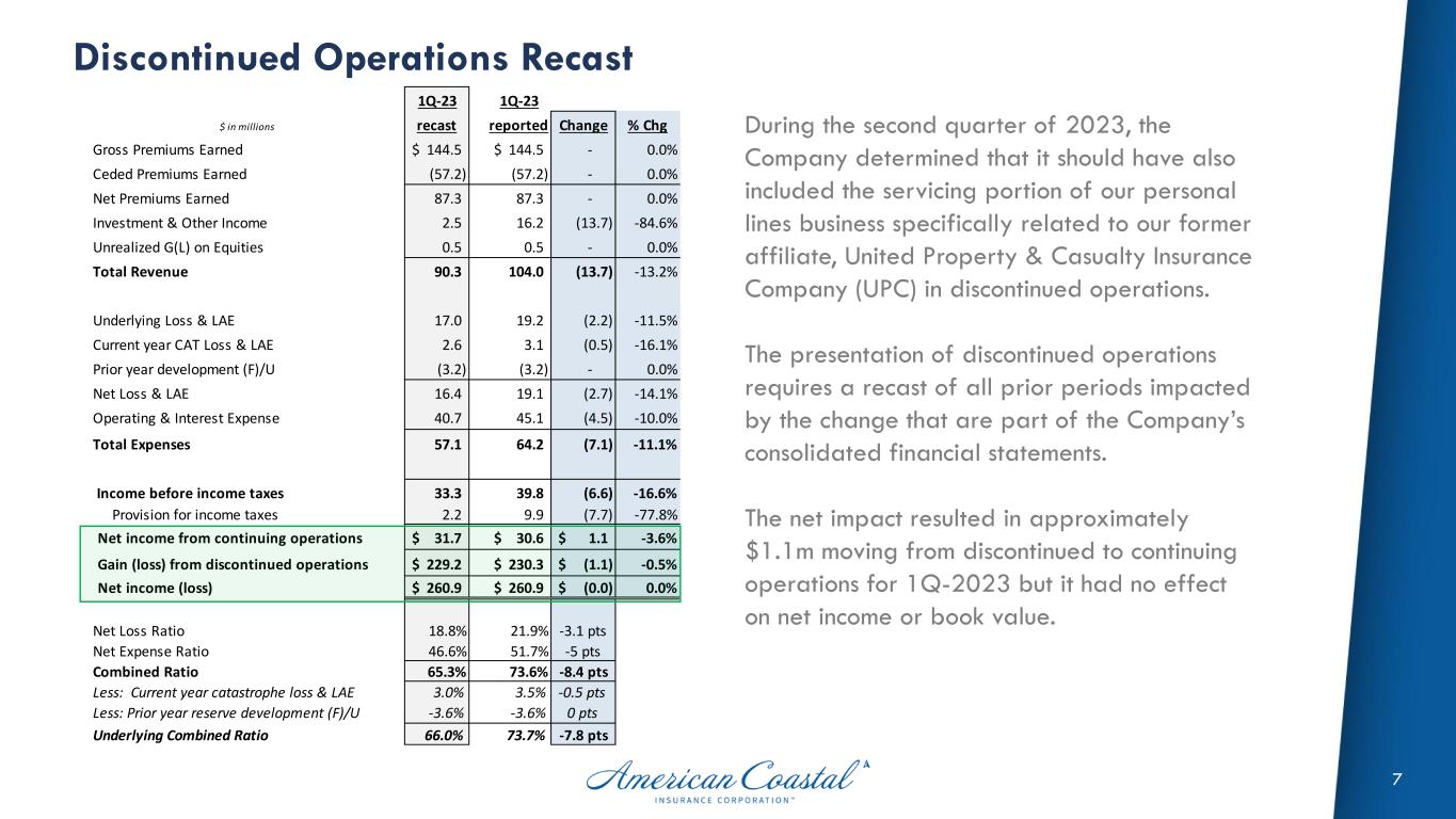 6 2Q-23 Segment Results Corrections made to discontinued operations impacted PL servicing revenue & expense QTD & YTD. CL – Commercial lines PL – Personal lines $ in millions CL PL Other Total CL PL Other Total Gross Premiums Earned 145.8$ 12.4$ -$ 158.2$ 277.8$ 24.8$ -$ 302.7$ Ceded Premiums Earned (71.8) (3.2) - (75.0) (125.2) (7.0) - (132.2) Net Premiums Earned 74.0 9.2 - 83.2 152.6 17.8 - 170.5 Investment & other revenue (4.9) 0.9 - (4.0) (3.1) 1.6 - (1.5) Unrealized G(L) on Equities 0.1 0.0 - 0.1 0.6 0.0 - 0.6 Total Revenue 69.3 10.0 - 79.3 150.1 19.4 - 169.6 Underlying Loss & LAE 15.3 4.2 - 19.5 29.9 6.5 - 36.5 Current year CAT Loss & LAE 6.2 0.3 - 6.5 8.3 0.9 - 9.2 Prior year development (5.3) 0.2 - (5.2) (8.1) (0.2) - (8.3) Total Loss 16.2 4.7 - 20.9 30.1 7.2 - 37.3 Operating & Interest Expense 27.7 7.4 3.0 38.1 55.8 17.1 6.0 78.8 Total Expenses 43.9 12.1 3.0 59.0 85.8 24.3 6.0 116.1 Other income (loss) - 0.8 - 0.8 - 1.6 (0.2) 1.4 Income (Loss) before tax 25.4$ (1.3)$ (3.0)$ 21.1 64.3$ (3.2)$ (6.2)$ 54.9 Three Months Ended Jun 30, 2023 Six Months Ended Jun 30, 2023