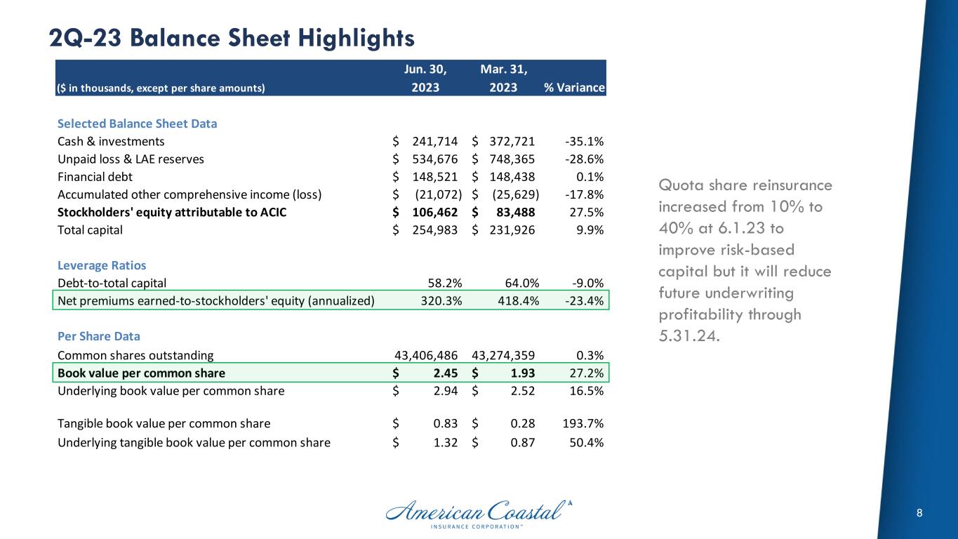 8 2Q-23 Balance Sheet Highlights Quota share reinsurance increased from 10% to 40% at 6.1.23 to improve risk-based capital but it will reduce future underwriting profitability through 5.31.24. Jun. 30, Mar. 31, ($ in thousands, except per share amounts) 2023 2023 % Variance Selected Balance Sheet Data Cash & investments 241,714$ 372,721$ -35.1% Unpaid loss & LAE reserves 534,676$ 748,365$ -28.6% Financial debt 148,521$ 148,438$ 0.1% Accumulated other comprehensive income (loss) (21,072)$ (25,629)$ -17.8% Stockholders' equity attributable to ACIC 106,462$ 83,488$ 27.5% Total capital 254,983$ 231,926$ 9.9% Leverage Ratios Debt-to-total capital 58.2% 64.0% -9.0% Net premiums earned-to-stockholders' equity (annualized) 320.3% 418.4% -23.4% Per Share Data Common shares outstanding 43,406,486 43,274,359 0.3% Book value per common share 2.45$ 1.93$ 27.2% Underlying book value per common share 2.94$ 2.52$ 16.5% Tangible book value per common share 0.83$ 0.28$ 193.7% Underlying tangible book value per common share 1.32$ 0.87$ 50.4%