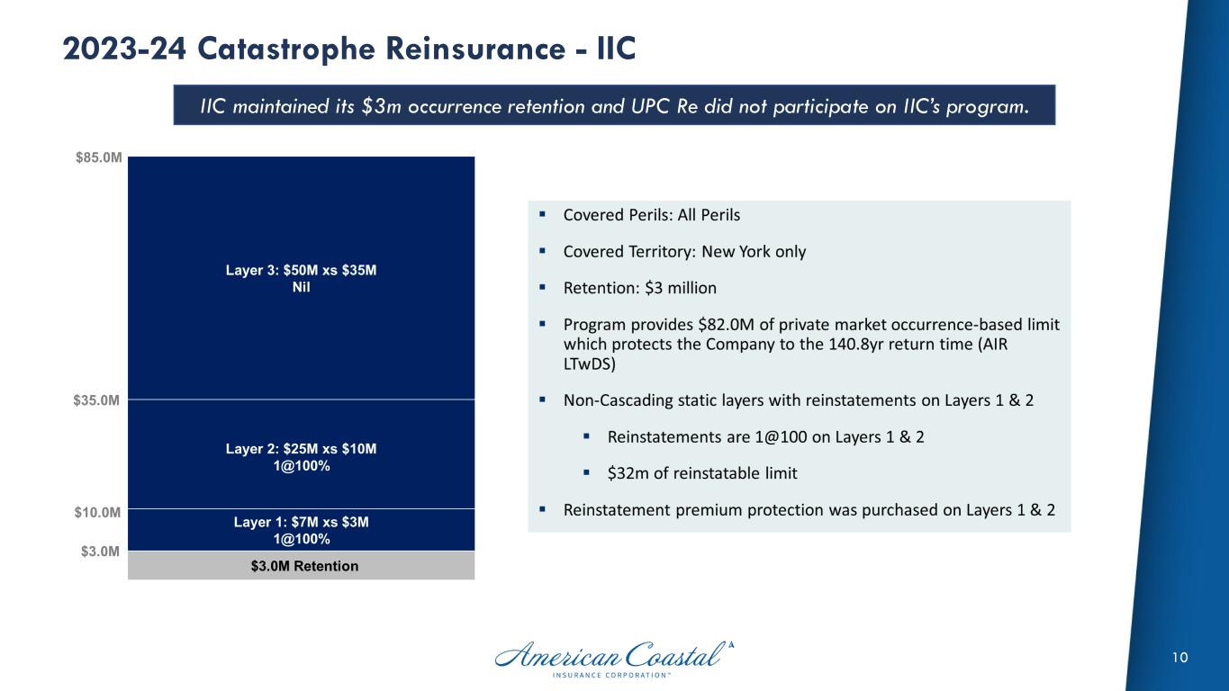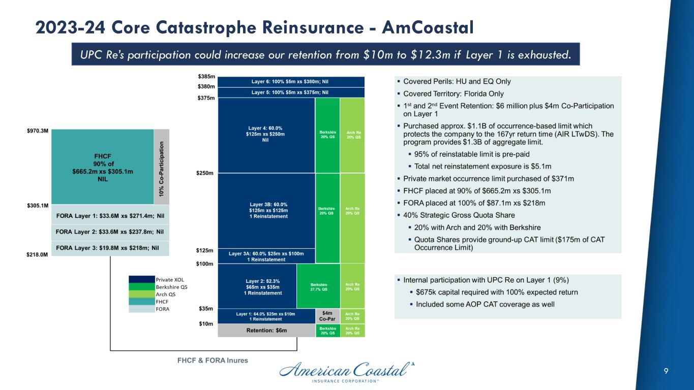 9 2023-24 Core Catastrophe Reinsurance - AmCoastal UPC Re’s participation could increase our retention from $10m to $12.3m if Layer 1 is exhausted.