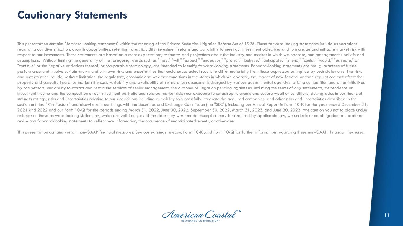 11 Cautionary Statements This presentation contains "forward-looking statements" within the meaning of the Private Securities Litigation Reform Act of 1995. These forward looking statements include expectations regarding our diversification, growth opportunities, retention rates, liquidity, investment returns and our ability to meet our investment objectives and to manage and mitigate market risk with respect to our investments. These statements are based on current expectations, estimates and projections about the industry and market in which we operate, and management's beliefs and assumptions. Without limiting the generality of the foregoing, words such as "may," "will," "expect," "endeavor," "project," "believe," "anticipate," "intend," "could," "would," "estimate," or "continue" or the negative variations thereof, or comparable terminology, are intended to identify forward-looking statements. Forward-looking statements are not guarantees of future performance and involve certain known and unknown risks and uncertainties that could cause actual results to differ materially from those expressed or implied by such statements. The risks and uncertainties include, without limitation: the regulatory, economic and weather conditions in the states in which we operate; the impact of new federal or state regulations that affect the property and casualty insurance market; the cost, variability and availability of reinsurance; assessments charged by various governmental agencies; pricing competition and other initiatives by competitors; our ability to attract and retain the services of senior management; the outcome of litigation pending against us, including the terms of any settlements; dependence on investment income and the composition of our investment portfolio and related market risks; our exposure to catastrophic events and severe weather conditions; downgrades in our financial strength ratings; risks and uncertainties relating to our acquisitions including our ability to successfully integrate the acquired companies; and other risks and uncertainties described in the section entitled "Risk Factors" and elsewhere in our filings with the Securities and Exchange Commission (the "SEC"), including our Annual Report in Form 10-K for the year ended December 31, 2021 and 2022 and our Form 10-Q for the periods ending March 31, 2022, June 30, 2022, September 30, 2022, March 31, 2023, and June 30, 2023. We caution you not to place undue reliance on these forward looking statements, which are valid only as of the date they were made. Except as may be required by applicable law, we undertake no obligation to update or revise any forward-looking statements to reflect new information, the occurrence of unanticipated events, or otherwise. This presentation contains certain non-GAAP financial measures. See our earnings release, Form 10-K ,and Form 10-Q for further information regarding these non-GAAP financial measures.