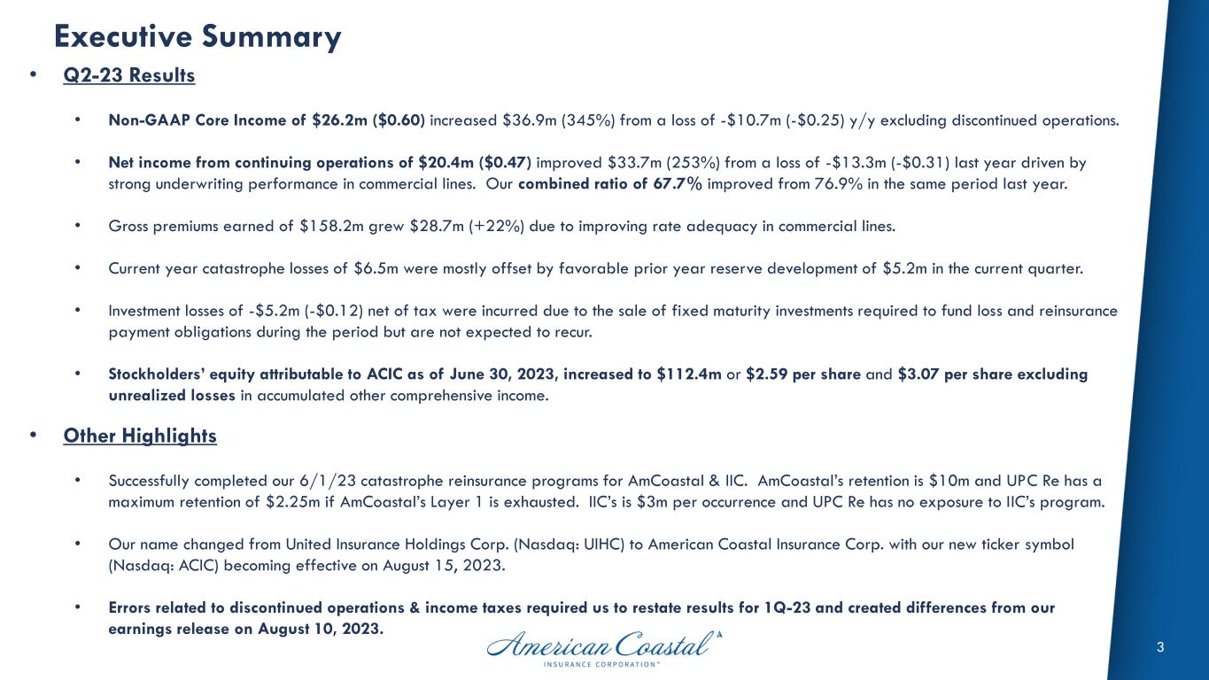 2 Company Overview ACIC is a specialty underwriter of catastrophe exposed property insurance. American Coastal Insurance Corp. (Nasdaq: ACIC - effective 8.15.2023) is the insurance holding company for two P&C carriers: American Coastal Insurance Company (AmCoastal) and Interboro Insurance Company (IIC) along with other operating affiliates. AmCoastal has the #1 market share of commercial residential property insurance (commercial lines) in Florida with roughly 4,600 policies and $617 million of premium in-force. IIC’s homeowners & fire insurance products (personal lines) are written exclusively in New York with approximately 15,800 policies and $33 million of premium in-force. ACIC as of June 30, 2023 Total Assets: $1.44 billion Total Equity: $112.4 million Annualized Revenue: $339.2 million Employees: 84 Headquarters: St. Petersburg, FL Credit Rating: BB+ (Kroll) Specialty Commercial Property Specialty Homeowners
