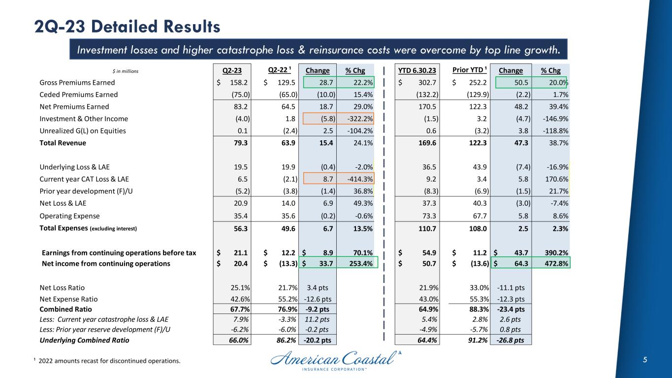 4 2Q-23 Summary Results A combined ratio of 67.7% combined with premium growth fueled significant improvements y/y. ¹ 2022 amounts recast for discontinued operations. $ in thousands, except per share amounts Q2-23 Q2-22 ¹ Change 2023 2022 ¹ Change Net income (loss) 17,779$ (69,029)$ n/m 285,059$ (102,201)$ n/m per diluted share (EPS) 0.42$ (1.60)$ 6.52$ (2.37)$ Reconciliation to core income (loss), net of tax: Investment gains (losses) (5,201)$ (1,950)$ (4,892)$ (2,529)$ Amortization of intangible assets (641)$ (641)$ (1,282)$ (1,283)$ Gain (loss) from discontinued operations (2,573)$ (55,744)$ 234,340$ (88,728)$ Total adjustments (8,415)$ (58,335)$ 228,166$ (92,539)$ Core income (loss) 26,194$ (10,693)$ 345.0% 56,893$ (9,660)$ 689.0% per diluted share (CEPS) 0.60$ (0.25)$ 1.30$ (0.22)$ Net loss & LAE ratio 25.1% 21.7% 21.9% 33.0% Net expense ratio 42.6% 55.2% 43.0% 55.3% Combined ratio 67.7% 76.9% (9.2) pts 64.9% 88.3% (23.4) pts Less: Net current year catastrophe loss & LAE 7.9% -3.3% 5.6% 2.8% Less: Net (favorable) unfavorable reserve development -6.2% -6.0% -4.9% -5.7% Underlying combined ratio 66.0% 86.2% (20.2) pts 64.1% 91.2% (27.1) pts
