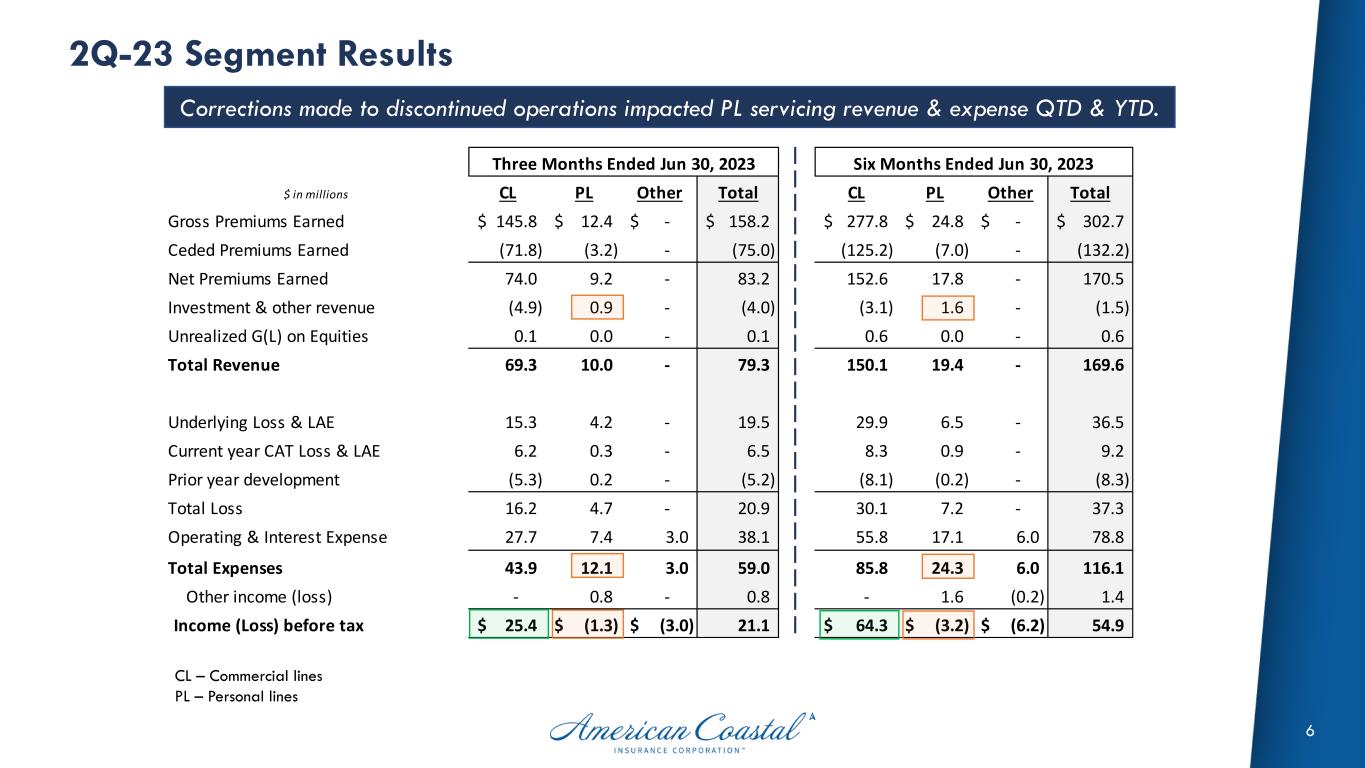 5 2Q-23 Detailed Results Investment losses and higher catastrophe loss & reinsurance costs were overcome by top line growth. ¹ 2022 amounts recast for discontinued operations. $ in millions Q2-23 Q2-22 ¹ Change % Chg Gross Premiums Earned 158.2$ 129.5$ 28.7 22.2% Ceded Premiums Earned (75.0) (65.0) (10.0) 15.4% Net Premiums Earned 83.2 64.5 18.7 29.0% Investment & Other Income (4.0) 1.8 (5.8) -322.2% Unrealized G(L) on Equities 0.1 (2.4) 2.5 -104.2% Total Revenue 79.3 63.9 15.4 24.1% Underlying Loss & LAE 19.5 19.9 (0.4) -2.0% Current year CAT Loss & LAE 6.5 (2.1) 8.7 -414.3% Prior year development (F)/U (5.2) (3.8) (1.4) 36.8% Net Loss & LAE 20.9 14.0 6.9 49.3% Operating Expense 35.4 35.6 (0.2) -0.6% Total Expenses (excluding interest) 56.3 49.6 6.7 13.5% Earnings from continuing operations before tax 21.1$ 12.2$ 8.9$ 70.1% Net income from continuing operations 20.4$ (13.3)$ 33.7$ 253.4% Net Loss Ratio 25.1% 21.7% 3.4 pts Net Expense Ratio 42.6% 55.2% -12.6 pts Combined Ratio 67.7% 76.9% -9.2 pts Less: Current year catastrophe loss & LAE 7.9% -3.3% 11.2 pts Less: Prior year reserve development (F)/U -6.2% -6.0% -0.2 pts Underlying Combined Ratio 66.0% 86.2% -20.2 pts YTD 6.30.23 Prior YTD ¹ Change % Chg 302.7$ 252.2$ 50.5 20.0% (132.2) (129.9) (2.2) 1.7% 170.5 122.3 48.2 39.4% (1.5) 3.2 (4.7) -146.9% 0.6 (3.2) 3.8 -118.8% 169.6 122.3 47.3 38.7% 36.5 43.9 (7.4) -16.9% 9.2 3.4 5.8 170.6% (8.3) (6.9) (1.5) 21.7% 37.3 40.3 (3.0) -7.4% 73.3 67.7 5.8 8.6% 110.7 108.0 2.5 2.3% 54.9$ 11.2$ 43.7$ 390.2% 50.7$ (13.6)$ 64.3$ 472.8% 21.9% 33.0% -11.1 pts 43.0% 55.3% -12.3 pts 64.9% 88.3% -23.4 pts 5.4% 2.8% 2.6 pts -4.9% -5.7% 0.8 pts 64.4% 91.2% -26.8 pts