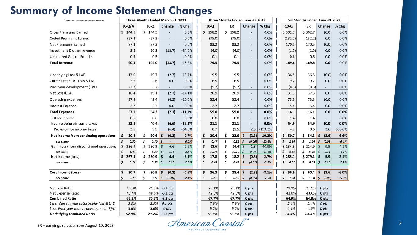 6 2Q-23 Segment Results Corrections made to discontinued operations impacted PL servicing revenue & expense QTD & YTD. CL – Commercial lines PL – Personal lines $ in millions CL PL Other Total CL PL Other Total Gross Premiums Earned 145.8$ 12.4$ -$ 158.2$ 277.8$ 24.8$ -$ 302.7$ Ceded Premiums Earned (71.8) (3.2) - (75.0) (125.2) (7.0) - (132.2) Net Premiums Earned 74.0 9.2 - 83.2 152.6 17.8 - 170.5 Investment & other revenue (4.9) 0.9 - (4.0) (3.1) 1.6 - (1.5) Unrealized G(L) on Equities 0.1 0.0 - 0.1 0.6 0.0 - 0.6 Total Revenue 69.3 10.0 - 79.3 150.1 19.4 - 169.6 Underlying Loss & LAE 15.3 4.2 - 19.5 29.9 6.5 - 36.5 Current year CAT Loss & LAE 6.2 0.3 - 6.5 8.3 0.9 - 9.2 Prior year development (5.3) 0.2 - (5.2) (8.1) (0.2) - (8.3) Total Loss 16.2 4.7 - 20.9 30.1 7.2 - 37.3 Operating & Interest Expense 27.7 7.4 3.0 38.1 55.8 17.1 6.0 78.8 Total Expenses 43.9 12.1 3.0 59.0 85.8 24.3 6.0 116.1 Other income (loss) - 0.8 - 0.8 - 1.6 (0.2) 1.4 Income (Loss) before tax 25.4$ (1.3)$ (3.0)$ 21.1 64.3$ (3.2)$ (6.2)$ 54.9 Three Months Ended Jun 30, 2023 Six Months Ended Jun 30, 2023