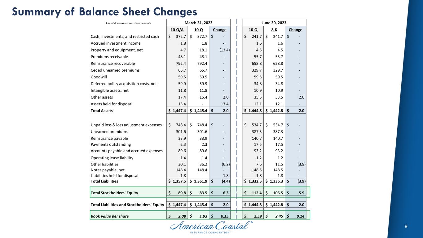 7 Summary of Income Statement Changes ER = earnings release from August 10, 2023 $ in millions except per share amounts 10-Q/A 10-Q Change % Chg 10-Q ER Change % Chg 10-Q ER Change % Chg Gross Premiums Earned 144.5$ 144.5$ - 0.0% 158.2$ 158.2$ - 0.0% 302.7$ 302.7$ (0.0) 0.0% Ceded Premiums Earned (57.2) (57.2) - 0.0% (75.0) (75.0) - 0.0% (132.2) (132.2) 0.0 0.0% Net Premiums Earned 87.3 87.3 - 0.0% 83.2 83.2 - 0.0% 170.5 170.5 (0.0) 0.0% Investment & other revenue 2.5 16.2 (13.7) -84.6% (4.0) (4.0) - 0.0% (1.5) (1.5) 0.0 0.0% Unrealized G(L) on Equities 0.5 0.5 - 0.0% 0.1 0.1 - 0.0% 0.6 0.6 0.0 0.0% Total Revenue 90.3 104.0 (13.7) -13.2% 79.3 79.3 - 0.0% 169.6 169.6 0.0 0.0% Underlying Loss & LAE 17.0 19.7 (2.7) -13.7% 19.5 19.5 - 0.0% 36.5 36.5 (0.0) 0.0% Current year CAT Loss & LAE 2.6 2.6 0.0 0.0% 6.5 6.5 - 0.0% 9.2 9.2 0.0 0.0% Prior year development (F)/U (3.2) (3.2) - 0.0% (5.2) (5.2) - 0.0% (8.3) (8.3) - 0.0% Net Loss & LAE 16.4 19.1 (2.7) -14.1% 20.9 20.9 - 0.0% 37.3 37.3 0.0 0.0% Operating expenses 37.9 42.4 (4.5) -10.6% 35.4 35.4 - 0.0% 73.3 73.3 (0.0) 0.0% Interest Expense 2.7 2.7 0.0 0.0% 2.7 2.7 - 0.0% 5.4 5.4 0.0 0.0% Total Expenses 57.1 64.2 (7.1) -11.1% 59.0 59.0 - 0.0% 116.1 116.1 0.0 0.0% Other income 0.6 0.6 - 0.0% 0.8 0.8 - 0.0% 1.4 1.4 - 0.0% Income before income taxes 33.8 40.4 (6.6) -16.3% 21.1 21.1 - 0.0% 54.9 54.9 (0.0) 0.0% Provision for income taxes 3.5 9.9 (6.4) -64.6% 0.7 (1.5) 2.3 -153.3% 4.2 0.6 3.6 600.0% Net income from continuing operations 30.4$ 30.6$ (0.2)$ -0.7% 20.4$ 22.6$ (2.3)$ -10.2% 50.7$ 54.3$ (3.6)$ -6.6% per share 0.70$ 0.70$ -$ 0.0% 0.47$ 0.52$ (0.06)$ -10.6% 1.16$ 1.24$ (0.08)$ -6.4% Gain (loss) from discontinued operations 236.9$ 230.3$ 6.6$ 2.9% (2.6)$ (4.4)$ 1.8$ -40.9% 234.3$ 224.9$ 9.5$ 4.2% per share 5.44$ 5.29$ 0.15$ 2.8% (0.06)$ (0.10)$ 0.04$ -41.3% 5.36$ 5.15$ 0.21$ 4.1% Net income (loss) 267.3$ 260.9$ 6.4$ 2.5% 17.8$ 18.2$ (0.5)$ -2.7% 285.1$ 279.1$ 5.9$ 2.1% per share 6.14$ 5.99$ 0.15$ 2.5% 0.41$ 0.42$ (0.01)$ -3.3% 6.52$ 6.39$ 0.13$ 2.1% Core Income (Loss) 30.7$ 30.9$ (0.2)$ -0.6% 26.2$ 28.4$ (2.3)$ -8.1% 56.9$ 60.4$ (3.6)$ -6.0% per share 0.70$ 0.71$ (0.01)$ -2.1% 0.60$ 0.65$ (0.05)$ -7.9% 1.30$ 1.38$ (0.08)$ -5.6% Net Loss Ratio 18.8% 21.9% -3.1 pts 25.1% 25.1% 0 pts 21.9% 21.9% 0 pts Net Expense Ratio 43.4% 48.6% -5.1 pts 42.6% 42.6% 0 pts 43.0% 43.0% 0 pts Combined Ratio 62.2% 70.5% -8.3 pts 67.7% 67.7% 0 pts 64.9% 64.9% 0 pts Less: Current year catastrophe loss & LAE 3.0% 2.9% 0.1 pts 7.9% 7.9% 0 pts 5.4% 5.4% 0 pts Less: Prior year reserve development (F)/U -3.6% -3.6% 0 pts -6.2% -6.2% 0 pts -4.9% -4.9% 0 pts Underlying Combined Ratio 62.9% 71.2% -8.3 pts 66.0% 66.0% 0 pts 64.4% 64.4% 0 pts Three Months Ended March 31, 2023 Three Months Ended June 30, 2023 Six Months Ended June 30, 2023