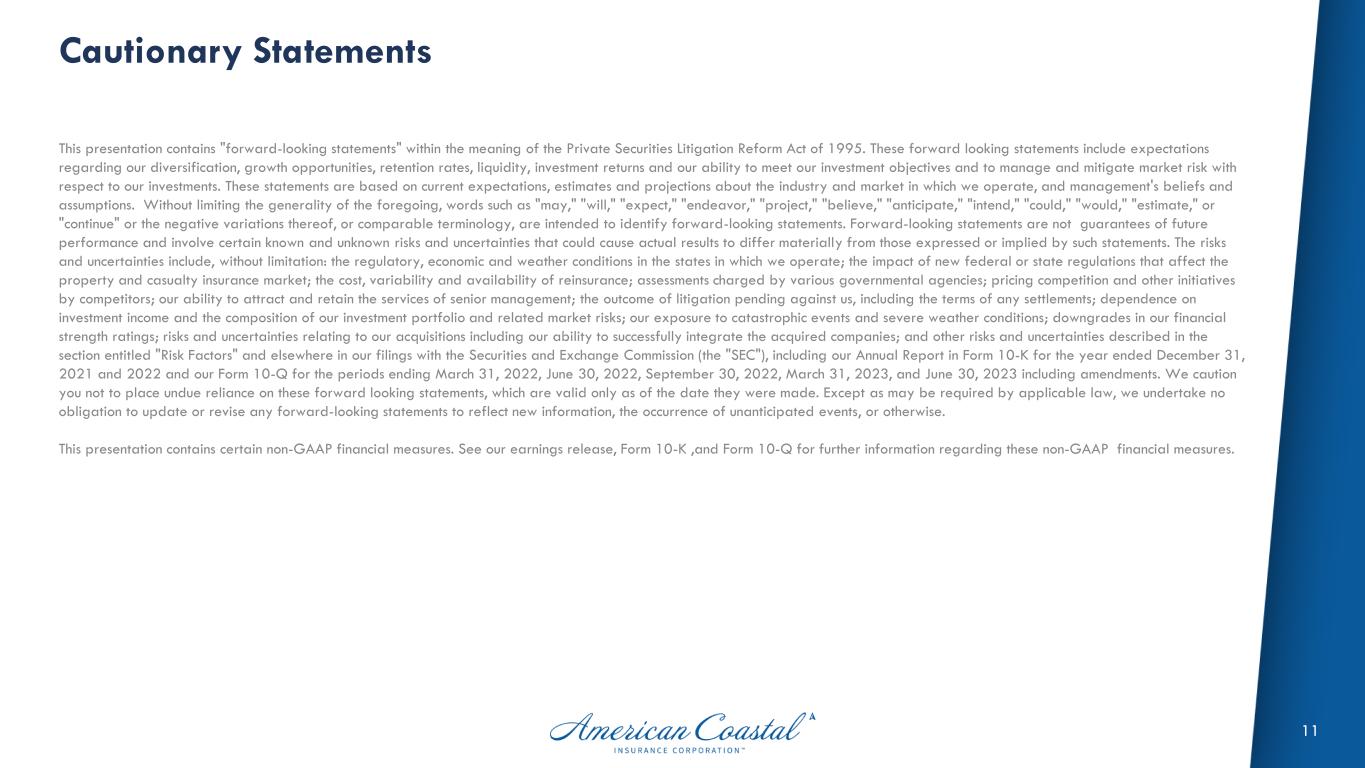11 Cautionary Statements This presentation contains "forward-looking statements" within the meaning of the Private Securities Litigation Reform Act of 1995. These forward looking statements include expectations regarding our diversification, growth opportunities, retention rates, liquidity, investment returns and our ability to meet our investment objectives and to manage and mitigate market risk with respect to our investments. These statements are based on current expectations, estimates and projections about the industry and market in which we operate, and management's beliefs and assumptions. Without limiting the generality of the foregoing, words such as "may," "will," "expect," "endeavor," "project," "believe," "anticipate," "intend," "could," "would," "estimate," or "continue" or the negative variations thereof, or comparable terminology, are intended to identify forward-looking statements. Forward-looking statements are not guarantees of future performance and involve certain known and unknown risks and uncertainties that could cause actual results to differ materially from those expressed or implied by such statements. The risks and uncertainties include, without limitation: the regulatory, economic and weather conditions in the states in which we operate; the impact of new federal or state regulations that affect the property and casualty insurance market; the cost, variability and availability of reinsurance; assessments charged by various governmental agencies; pricing competition and other initiatives by competitors; our ability to attract and retain the services of senior management; the outcome of litigation pending against us, including the terms of any settlements; dependence on investment income and the composition of our investment portfolio and related market risks; our exposure to catastrophic events and severe weather conditions; downgrades in our financial strength ratings; risks and uncertainties relating to our acquisitions including our ability to successfully integrate the acquired companies; and other risks and uncertainties described in the section entitled "Risk Factors" and elsewhere in our filings with the Securities and Exchange Commission (the "SEC"), including our Annual Report in Form 10-K for the year ended December 31, 2021 and 2022 and our Form 10-Q for the periods ending March 31, 2022, June 30, 2022, September 30, 2022, March 31, 2023, and June 30, 2023 including amendments. We caution you not to place undue reliance on these forward looking statements, which are valid only as of the date they were made. Except as may be required by applicable law, we undertake no obligation to update or revise any forward-looking statements to reflect new information, the occurrence of unanticipated events, or otherwise. This presentation contains certain non-GAAP financial measures. See our earnings release, Form 10-K ,and Form 10-Q for further information regarding these non-GAAP financial measures.