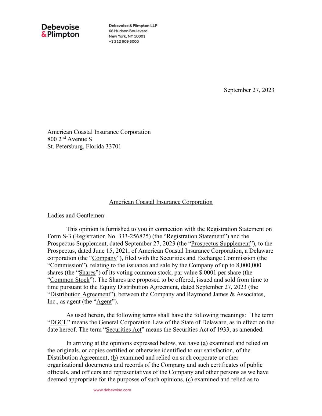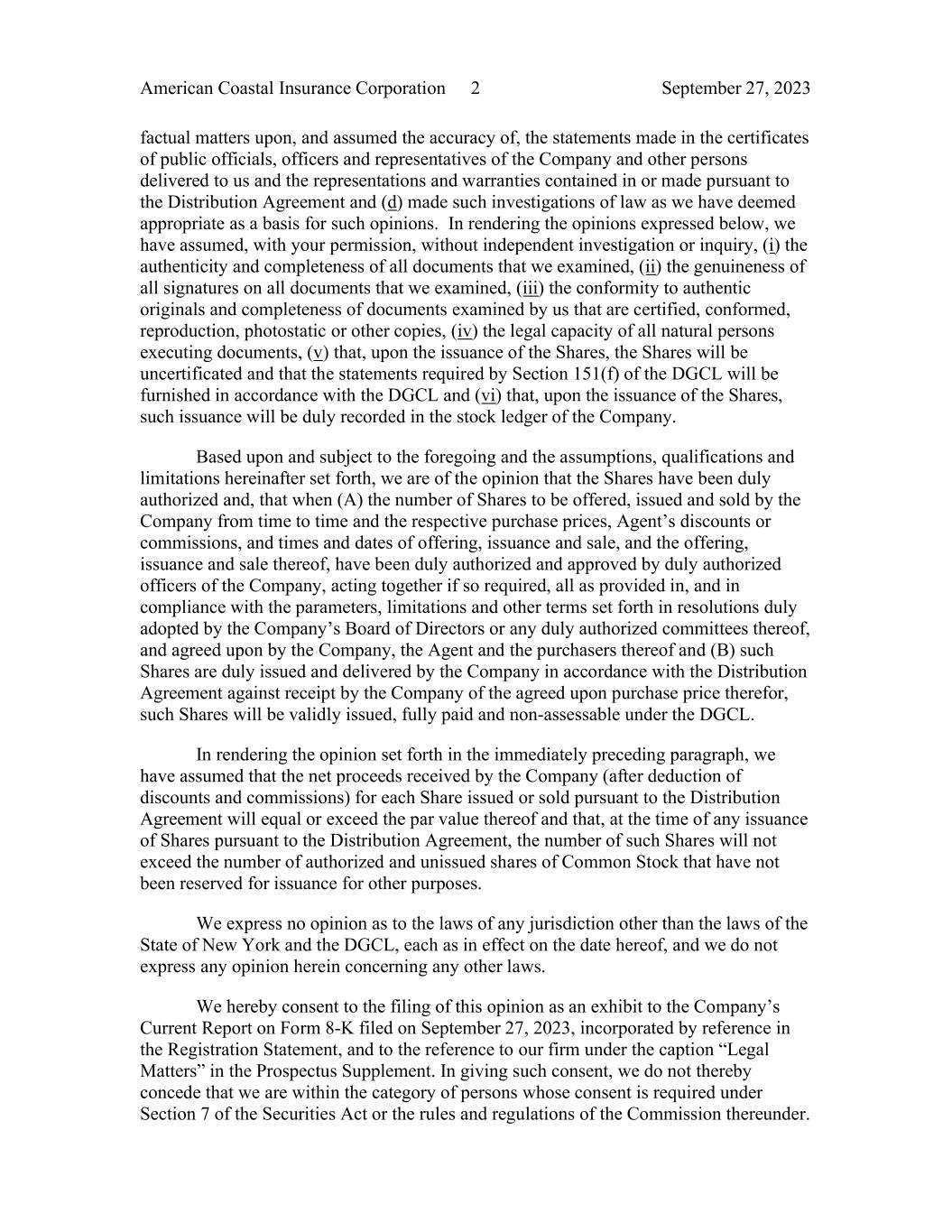 American Coastal Insurance Corporation 2 September 27, 2023 factual matters upon, and assumed the accuracy of, the statements made in the certificates of public officials, officers and representatives of the Company and other persons delivered to us and the representations and warranties contained in or made pursuant to the Distribution Agreement and (d) made such investigations of law as we have deemed appropriate as a basis for such opinions. In rendering the opinions expressed below, we have assumed, with your permission, without independent investigation or inquiry, (i) the authenticity and completeness of all documents that we examined, (ii) the genuineness of all signatures on all documents that we examined, (iii) the conformity to authentic originals and completeness of documents examined by us that are certified, conformed, reproduction, photostatic or other copies, (iv) the legal capacity of all natural persons executing documents, (v) that, upon the issuance of the Shares, the Shares will be uncertificated and that the statements required by Section 151(f) of the DGCL will be furnished in accordance with the DGCL and (vi) that, upon the issuance of the Shares, such issuance will be duly recorded in the stock ledger of the Company. Based upon and subject to the foregoing and the assumptions, qualifications and limitations hereinafter set forth, we are of the opinion that the Shares have been duly authorized and, that when (A) the number of Shares to be offered, issued and sold by the Company from time to time and the respective purchase prices, Agent’s discounts or commissions, and times and dates of offering, issuance and sale, and the offering, issuance and sale thereof, have been duly authorized and approved by duly authorized officers of the Company, acting together if so required, all as provided in, and in compliance with the parameters, limitations and other terms set forth in resolutions duly adopted by the Company’s Board of Directors or any duly authorized committees thereof, and agreed upon by the Company, the Agent and the purchasers thereof and (B) such Shares are duly issued and delivered by the Company in accordance with the Distribution Agreement against receipt by the Company of the agreed upon purchase price therefor, such Shares will be validly issued, fully paid and non-assessable under the DGCL. In rendering the opinion set forth in the immediately preceding paragraph, we have assumed that the net proceeds received by the Company (after deduction of discounts and commissions) for each Share issued or sold pursuant to the Distribution Agreement will equal or exceed the par value thereof and that, at the time of any issuance of Shares pursuant to the Distribution Agreement, the number of such Shares will not exceed the number of authorized and unissued shares of Common Stock that have not been reserved for issuance for other purposes. We express no opinion as to the laws of any jurisdiction other than the laws of the State of New York and the DGCL, each as in effect on the date hereof, and we do not express any opinion herein concerning any other laws. We hereby consent to the filing of this opinion as an exhibit to the Company’s Current Report on Form 8-K filed on September 27, 2023, incorporated by reference in the Registration Statement, and to the reference to our firm under the caption “Legal Matters” in the Prospectus Supplement. In giving such consent, we do not thereby concede that we are within the category of persons whose consent is required under Section 7 of the Securities Act or the rules and regulations of the Commission thereunder.