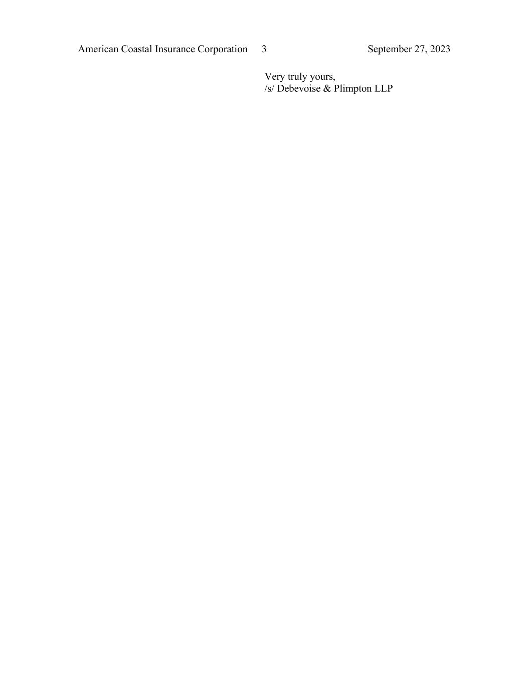 American Coastal Insurance Corporation 3 September 27, 2023 Very truly yours, /s/ Debevoise & Plimpton LLP