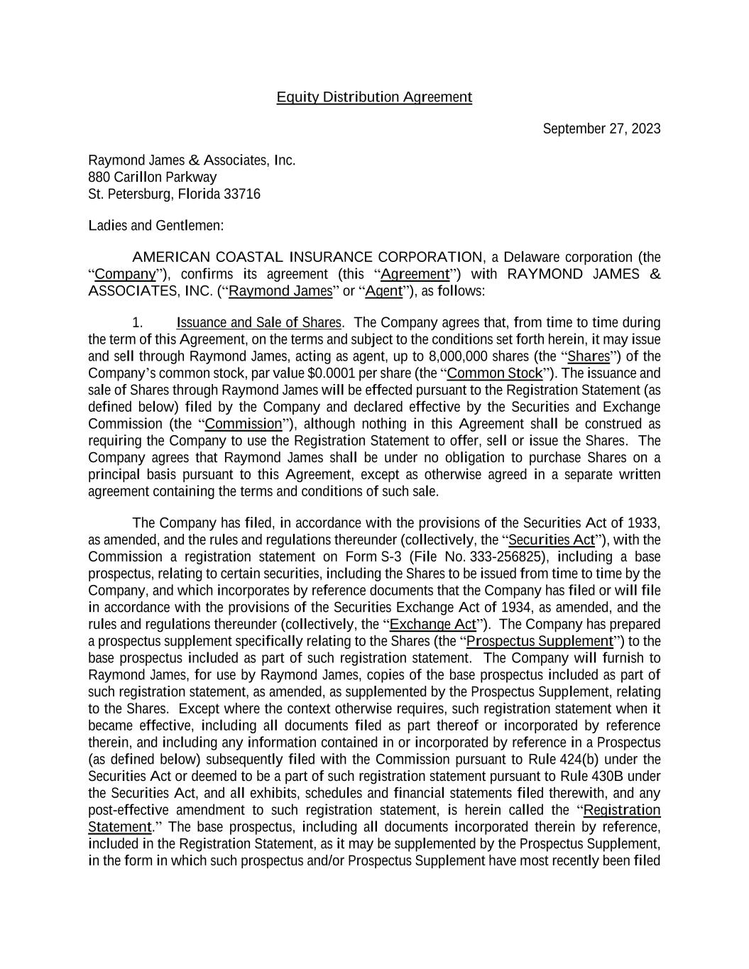 Equity Distribution Agreement September 27, 2023 Raymond James & Associates, Inc. 880 Carillon Parkway St. Petersburg, Florida 33716 Ladies and Gentlemen: AMERICAN COASTAL INSURANCE CORPORATION, a Delaware corporation (the “Company”), confirms its agreement (this “Agreement”) with RAYMOND JAMES & ASSOCIATES, INC. (“Raymond James” or “Agent”), as follows: 1. Issuance and Sale of Shares. The Company agrees that, from time to time during the term of this Agreement, on the terms and subject to the conditions set forth herein, it may issue and sell through Raymond James, acting as agent, up to 8,000,000 shares (the “Shares”) of the Company’s common stock, par value $0.0001 per share (the “Common Stock”). The issuance and sale of Shares through Raymond James will be effected pursuant to the Registration Statement (as defined below) filed by the Company and declared effective by the Securities and Exchange Commission (the “Commission”), although nothing in this Agreement shall be construed as requiring the Company to use the Registration Statement to offer, sell or issue the Shares. The Company agrees that Raymond James shall be under no obligation to purchase Shares on a principal basis pursuant to this Agreement, except as otherwise agreed in a separate written agreement containing the terms and conditions of such sale. The Company has filed, in accordance with the provisions of the Securities Act of 1933, as amended, and the rules and regulations thereunder (collectively, the “Securities Act”), with the Commission a registration statement on Form S-3 (File No. 333-256825), including a base prospectus, relating to certain securities, including the Shares to be issued from time to time by the Company, and which incorporates by reference documents that the Company has filed or will file in accordance with the provisions of the Securities Exchange Act of 1934, as amended, and the rules and regulations thereunder (collectively, the “Exchange Act”). The Company has prepared a prospectus supplement specifically relating to the Shares (the “Prospectus Supplement”) to the base prospectus included as part of such registration statement. The Company will furnish to Raymond James, for use by Raymond James, copies of the base prospectus included as part of such registration statement, as amended, as supplemented by the Prospectus Supplement, relating to the Shares. Except where the context otherwise requires, such registration statement when it became effective, including all documents filed as part thereof or incorporated by reference therein, and including any information contained in or incorporated by reference in a Prospectus (as defined below) subsequently filed with the Commission pursuant to Rule 424(b) under the Securities Act or deemed to be a part of such registration statement pursuant to Rule 430B under the Securities Act, and all exhibits, schedules and financial statements filed therewith, and any post-effective amendment to such registration statement, is herein called the “Registration Statement.” The base prospectus, including all documents incorporated therein by reference, included in the Registration Statement, as it may be supplemented by the Prospectus Supplement, in the form in which such prospectus and/or Prospectus Supplement have most recently been filed