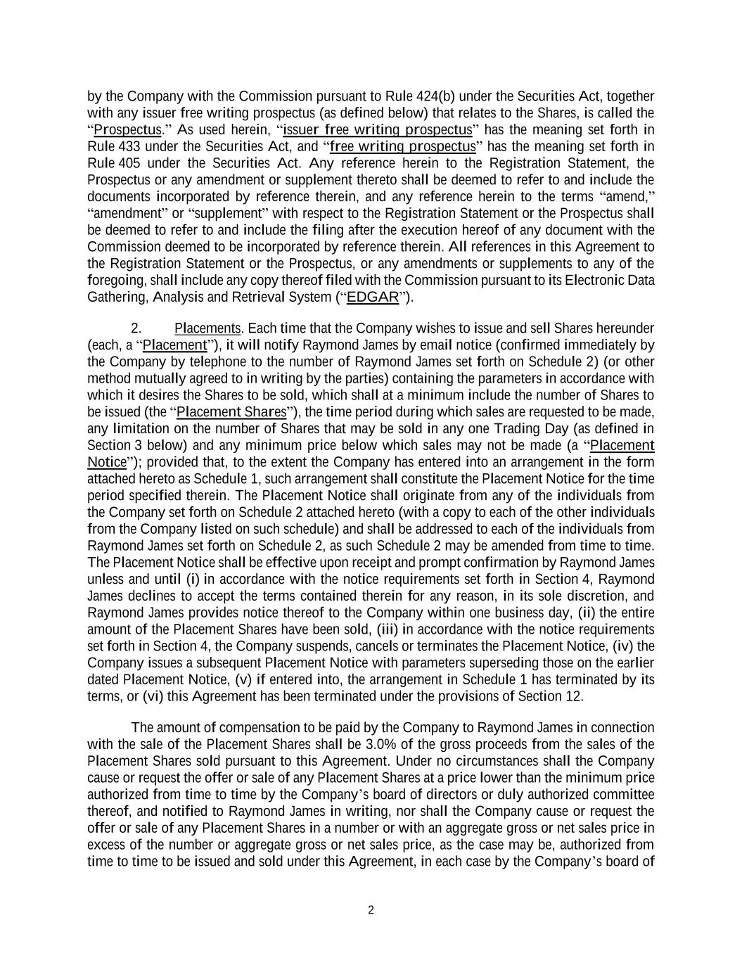 2 by the Company with the Commission pursuant to Rule 424(b) under the Securities Act, together with any issuer free writing prospectus (as defined below) that relates to the Shares, is called the “Prospectus.” As used herein, “issuer free writing prospectus” has the meaning set forth in Rule 433 under the Securities Act, and “free writing prospectus” has the meaning set forth in Rule 405 under the Securities Act. Any reference herein to the Registration Statement, the Prospectus or any amendment or supplement thereto shall be deemed to refer to and include the documents incorporated by reference therein, and any reference herein to the terms “amend,” “amendment” or “supplement” with respect to the Registration Statement or the Prospectus shall be deemed to refer to and include the filing after the execution hereof of any document with the Commission deemed to be incorporated by reference therein. All references in this Agreement to the Registration Statement or the Prospectus, or any amendments or supplements to any of the foregoing, shall include any copy thereof filed with the Commission pursuant to its Electronic Data Gathering, Analysis and Retrieval System (“EDGAR”). 2. Placements. Each time that the Company wishes to issue and sell Shares hereunder (each, a “Placement”), it will notify Raymond James by email notice (confirmed immediately by the Company by telephone to the number of Raymond James set forth on Schedule 2) (or other method mutually agreed to in writing by the parties) containing the parameters in accordance with which it desires the Shares to be sold, which shall at a minimum include the number of Shares to be issued (the “Placement Shares”), the time period during which sales are requested to be made, any limitation on the number of Shares that may be sold in any one Trading Day (as defined in Section 3 below) and any minimum price below which sales may not be made (a “Placement Notice”); provided that, to the extent the Company has entered into an arrangement in the form attached hereto as Schedule 1, such arrangement shall constitute the Placement Notice for the time period specified therein. The Placement Notice shall originate from any of the individuals from the Company set forth on Schedule 2 attached hereto (with a copy to each of the other individuals from the Company listed on such schedule) and shall be addressed to each of the individuals from Raymond James set forth on Schedule 2, as such Schedule 2 may be amended from time to time. The Placement Notice shall be effective upon receipt and prompt confirmation by Raymond James unless and until (i) in accordance with the notice requirements set forth in Section 4, Raymond James declines to accept the terms contained therein for any reason, in its sole discretion, and Raymond James provides notice thereof to the Company within one business day, (ii) the entire amount of the Placement Shares have been sold, (iii) in accordance with the notice requirements set forth in Section 4, the Company suspends, cancels or terminates the Placement Notice, (iv) the Company issues a subsequent Placement Notice with parameters superseding those on the earlier dated Placement Notice, (v) if entered into, the arrangement in Schedule 1 has terminated by its terms, or (vi) this Agreement has been terminated under the provisions of Section 12. The amount of compensation to be paid by the Company to Raymond James in connection with the sale of the Placement Shares shall be 3.0% of the gross proceeds from the sales of the Placement Shares sold pursuant to this Agreement. Under no circumstances shall the Company cause or request the offer or sale of any Placement Shares at a price lower than the minimum price authorized from time to time by the Company’s board of directors or duly authorized committee thereof, and notified to Raymond James in writing, nor shall the Company cause or request the offer or sale of any Placement Shares in a number or with an aggregate gross or net sales price in excess of the number or aggregate gross or net sales price, as the case may be, authorized from time to time to be issued and sold under this Agreement, in each case by the Company’s board of