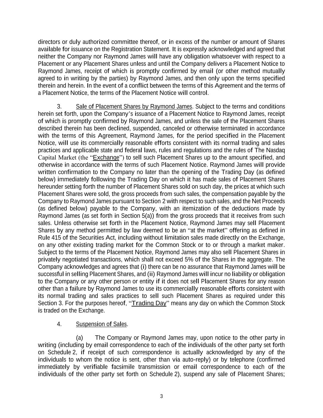 3 directors or duly authorized committee thereof, or in excess of the number or amount of Shares available for issuance on the Registration Statement. It is expressly acknowledged and agreed that neither the Company nor Raymond James will have any obligation whatsoever with respect to a Placement or any Placement Shares unless and until the Company delivers a Placement Notice to Raymond James, receipt of which is promptly confirmed by email (or other method mutually agreed to in writing by the parties) by Raymond James, and then only upon the terms specified therein and herein. In the event of a conflict between the terms of this Agreement and the terms of a Placement Notice, the terms of the Placement Notice will control. 3. Sale of Placement Shares by Raymond James. Subject to the terms and conditions herein set forth, upon the Company’s issuance of a Placement Notice to Raymond James, receipt of which is promptly confirmed by Raymond James, and unless the sale of the Placement Shares described therein has been declined, suspended, canceled or otherwise terminated in accordance with the terms of this Agreement, Raymond James, for the period specified in the Placement Notice, will use its commercially reasonable efforts consistent with its normal trading and sales practices and applicable state and federal laws, rules and regulations and the rules of The Nasdaq Capital Market (the “Exchange”) to sell such Placement Shares up to the amount specified, and otherwise in accordance with the terms of such Placement Notice. Raymond James will provide written confirmation to the Company no later than the opening of the Trading Day (as defined below) immediately following the Trading Day on which it has made sales of Placement Shares hereunder setting forth the number of Placement Shares sold on such day, the prices at which such Placement Shares were sold, the gross proceeds from such sales, the compensation payable by the Company to Raymond James pursuant to Section 2 with respect to such sales, and the Net Proceeds (as defined below) payable to the Company, with an itemization of the deductions made by Raymond James (as set forth in Section 5(a)) from the gross proceeds that it receives from such sales. Unless otherwise set forth in the Placement Notice, Raymond James may sell Placement Shares by any method permitted by law deemed to be an “at the market” offering as defined in Rule 415 of the Securities Act, including without limitation sales made directly on the Exchange, on any other existing trading market for the Common Stock or to or through a market maker. Subject to the terms of the Placement Notice, Raymond James may also sell Placement Shares in privately negotiated transactions, which shall not exceed 5% of the Shares in the aggregate. The Company acknowledges and agrees that (i) there can be no assurance that Raymond James will be successful in selling Placement Shares, and (ii) Raymond James will incur no liability or obligation to the Company or any other person or entity if it does not sell Placement Shares for any reason other than a failure by Raymond James to use its commercially reasonable efforts consistent with its normal trading and sales practices to sell such Placement Shares as required under this Section 3. For the purposes hereof, “Trading Day” means any day on which the Common Stock is traded on the Exchange. 4. Suspension of Sales. (a) The Company or Raymond James may, upon notice to the other party in writing (including by email correspondence to each of the individuals of the other party set forth on Schedule 2, if receipt of such correspondence is actually acknowledged by any of the individuals to whom the notice is sent, other than via auto-reply) or by telephone (confirmed immediately by verifiable facsimile transmission or email correspondence to each of the individuals of the other party set forth on Schedule 2), suspend any sale of Placement Shares;