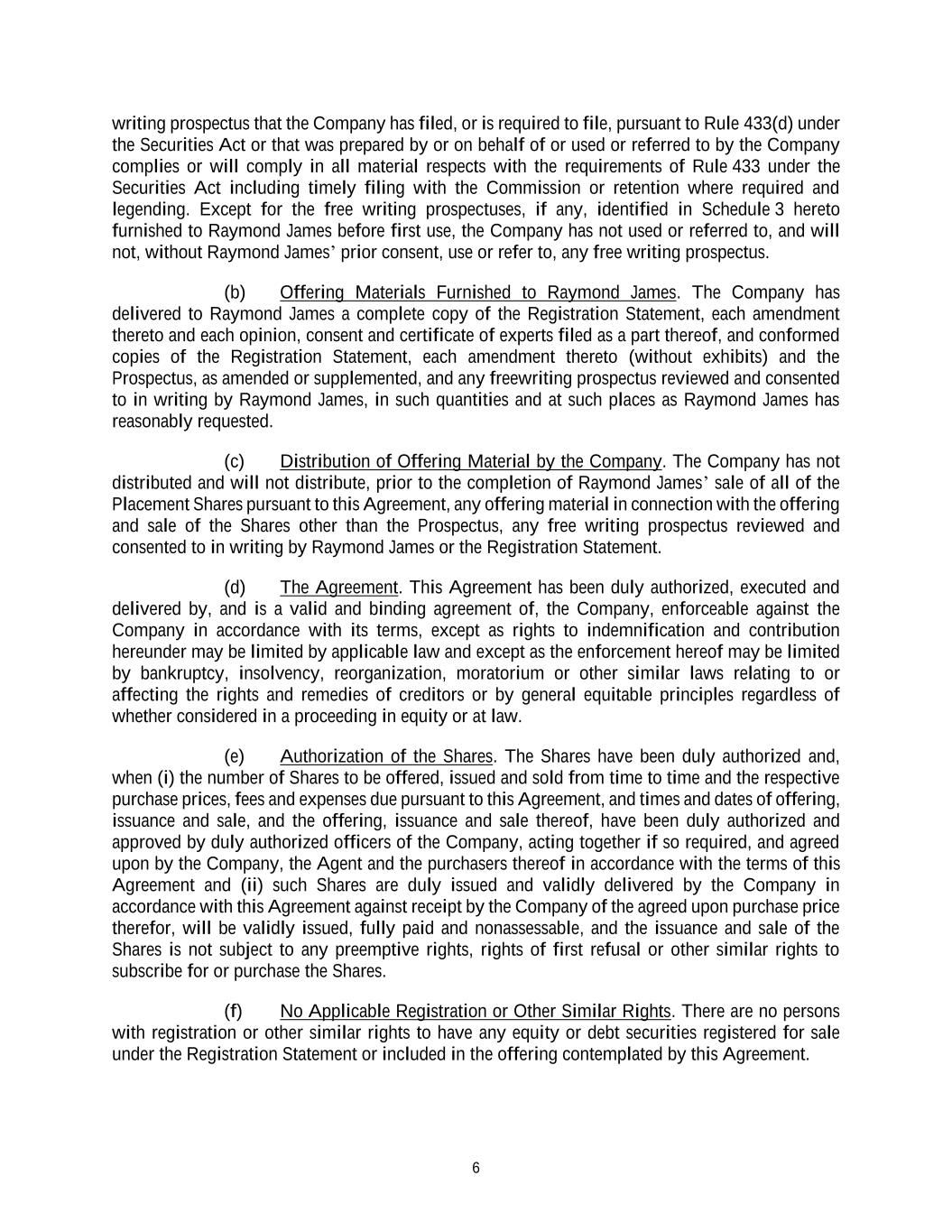 6 writing prospectus that the Company has filed, or is required to file, pursuant to Rule 433(d) under the Securities Act or that was prepared by or on behalf of or used or referred to by the Company complies or will comply in all material respects with the requirements of Rule 433 under the Securities Act including timely filing with the Commission or retention where required and legending. Except for the free writing prospectuses, if any, identified in Schedule 3 hereto furnished to Raymond James before first use, the Company has not used or referred to, and will not, without Raymond James’ prior consent, use or refer to, any free writing prospectus. (b) Offering Materials Furnished to Raymond James. The Company has delivered to Raymond James a complete copy of the Registration Statement, each amendment thereto and each opinion, consent and certificate of experts filed as a part thereof, and conformed copies of the Registration Statement, each amendment thereto (without exhibits) and the Prospectus, as amended or supplemented, and any freewriting prospectus reviewed and consented to in writing by Raymond James, in such quantities and at such places as Raymond James has reasonably requested. (c) Distribution of Offering Material by the Company. The Company has not distributed and will not distribute, prior to the completion of Raymond James’ sale of all of the Placement Shares pursuant to this Agreement, any offering material in connection with the offering and sale of the Shares other than the Prospectus, any free writing prospectus reviewed and consented to in writing by Raymond James or the Registration Statement. (d) The Agreement. This Agreement has been duly authorized, executed and delivered by, and is a valid and binding agreement of, the Company, enforceable against the Company in accordance with its terms, except as rights to indemnification and contribution hereunder may be limited by applicable law and except as the enforcement hereof may be limited by bankruptcy, insolvency, reorganization, moratorium or other similar laws relating to or affecting the rights and remedies of creditors or by general equitable principles regardless of whether considered in a proceeding in equity or at law. (e) Authorization of the Shares. The Shares have been duly authorized and, when (i) the number of Shares to be offered, issued and sold from time to time and the respective purchase prices, fees and expenses due pursuant to this Agreement, and times and dates of offering, issuance and sale, and the offering, issuance and sale thereof, have been duly authorized and approved by duly authorized officers of the Company, acting together if so required, and agreed upon by the Company, the Agent and the purchasers thereof in accordance with the terms of this Agreement and (ii) such Shares are duly issued and validly delivered by the Company in accordance with this Agreement against receipt by the Company of the agreed upon purchase price therefor, will be validly issued, fully paid and nonassessable, and the issuance and sale of the Shares is not subject to any preemptive rights, rights of first refusal or other similar rights to subscribe for or purchase the Shares. (f) No Applicable Registration or Other Similar Rights. There are no persons with registration or other similar rights to have any equity or debt securities registered for sale under the Registration Statement or included in the offering contemplated by this Agreement.