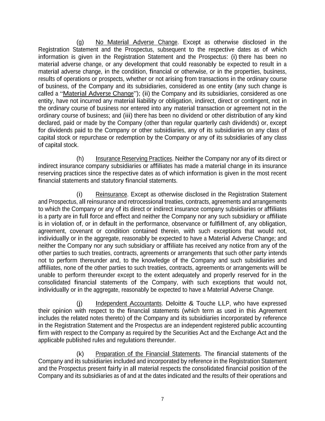 7 (g) No Material Adverse Change. Except as otherwise disclosed in the Registration Statement and the Prospectus, subsequent to the respective dates as of which information is given in the Registration Statement and the Prospectus: (i) there has been no material adverse change, or any development that could reasonably be expected to result in a material adverse change, in the condition, financial or otherwise, or in the properties, business, results of operations or prospects, whether or not arising from transactions in the ordinary course of business, of the Company and its subsidiaries, considered as one entity (any such change is called a “Material Adverse Change”); (ii) the Company and its subsidiaries, considered as one entity, have not incurred any material liability or obligation, indirect, direct or contingent, not in the ordinary course of business nor entered into any material transaction or agreement not in the ordinary course of business; and (iii) there has been no dividend or other distribution of any kind declared, paid or made by the Company (other than regular quarterly cash dividends) or, except for dividends paid to the Company or other subsidiaries, any of its subsidiaries on any class of capital stock or repurchase or redemption by the Company or any of its subsidiaries of any class of capital stock. (h) Insurance Reserving Practices. Neither the Company nor any of its direct or indirect insurance company subsidiaries or affiliates has made a material change in its insurance reserving practices since the respective dates as of which information is given in the most recent financial statements and statutory financial statements. (i) Reinsurance. Except as otherwise disclosed in the Registration Statement and Prospectus, all reinsurance and retrocessional treaties, contracts, agreements and arrangements to which the Company or any of its direct or indirect insurance company subsidiaries or affiliates is a party are in full force and effect and neither the Company nor any such subsidiary or affiliate is in violation of, or in default in the performance, observance or fulfillment of, any obligation, agreement, covenant or condition contained therein, with such exceptions that would not, individually or in the aggregate, reasonably be expected to have a Material Adverse Change; and neither the Company nor any such subsidiary or affiliate has received any notice from any of the other parties to such treaties, contracts, agreements or arrangements that such other party intends not to perform thereunder and, to the knowledge of the Company and such subsidiaries and affiliates, none of the other parties to such treaties, contracts, agreements or arrangements will be unable to perform thereunder except to the extent adequately and properly reserved for in the consolidated financial statements of the Company, with such exceptions that would not, individually or in the aggregate, reasonably be expected to have a Material Adverse Change. (j) Independent Accountants. Deloitte & Touche LLP, who have expressed their opinion with respect to the financial statements (which term as used in this Agreement includes the related notes thereto) of the Company and its subsidiaries incorporated by reference in the Registration Statement and the Prospectus are an independent registered public accounting firm with respect to the Company as required by the Securities Act and the Exchange Act and the applicable published rules and regulations thereunder. (k) Preparation of the Financial Statements. The financial statements of the Company and its subsidiaries included and incorporated by reference in the Registration Statement and the Prospectus present fairly in all material respects the consolidated financial position of the Company and its subsidiaries as of and at the dates indicated and the results of their operations and