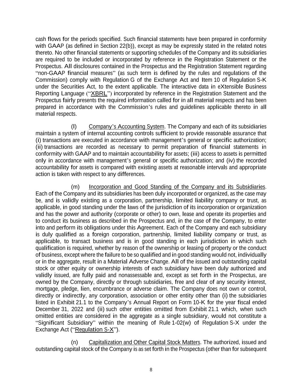 8 cash flows for the periods specified. Such financial statements have been prepared in conformity with GAAP (as defined in Section 22(b)), except as may be expressly stated in the related notes thereto. No other financial statements or supporting schedules of the Company and its subsidiaries are required to be included or incorporated by reference in the Registration Statement or the Prospectus. All disclosures contained in the Prospectus and the Registration Statement regarding “non-GAAP financial measures” (as such term is defined by the rules and regulations of the Commission) comply with Regulation G of the Exchange Act and Item 10 of Regulation S-K under the Securities Act, to the extent applicable. The interactive data in eXtensible Business Reporting Language (“XBRL”) incorporated by reference in the Registration Statement and the Prospectus fairly presents the required information called for in all material respects and has been prepared in accordance with the Commission’s rules and guidelines applicable thereto in all material respects. (l) Company’s Accounting System. The Company and each of its subsidiaries maintain a system of internal accounting controls sufficient to provide reasonable assurance that (i) transactions are executed in accordance with management’s general or specific authorization; (ii) transactions are recorded as necessary to permit preparation of financial statements in conformity with GAAP and to maintain accountability for assets; (iii) access to assets is permitted only in accordance with management’s general or specific authorization; and (iv) the recorded accountability for assets is compared with existing assets at reasonable intervals and appropriate action is taken with respect to any differences. (m) Incorporation and Good Standing of the Company and its Subsidiaries. Each of the Company and its subsidiaries has been duly incorporated or organized, as the case may be, and is validly existing as a corporation, partnership, limited liability company or trust, as applicable, in good standing under the laws of the jurisdiction of its incorporation or organization and has the power and authority (corporate or other) to own, lease and operate its properties and to conduct its business as described in the Prospectus and, in the case of the Company, to enter into and perform its obligations under this Agreement. Each of the Company and each subsidiary is duly qualified as a foreign corporation, partnership, limited liability company or trust, as applicable, to transact business and is in good standing in each jurisdiction in which such qualification is required, whether by reason of the ownership or leasing of property or the conduct of business, except where the failure to be so qualified and in good standing would not, individually or in the aggregate, result in a Material Adverse Change. All of the issued and outstanding capital stock or other equity or ownership interests of each subsidiary have been duly authorized and validly issued, are fully paid and nonassessable and, except as set forth in the Prospectus, are owned by the Company, directly or through subsidiaries, free and clear of any security interest, mortgage, pledge, lien, encumbrance or adverse claim. The Company does not own or control, directly or indirectly, any corporation, association or other entity other than (i) the subsidiaries listed in Exhibit 21.1 to the Company’s Annual Report on Form 10-K for the year fiscal ended December 31, 2022 and (ii) such other entities omitted from Exhibit 21.1 which, when such omitted entities are considered in the aggregate as a single subsidiary, would not constitute a “Significant Subsidiary” within the meaning of Rule 1-02(w) of Regulation S-X under the Exchange Act (“Regulation S-X”). (n) Capitalization and Other Capital Stock Matters. The authorized, issued and outstanding capital stock of the Company is as set forth in the Prospectus (other than for subsequent