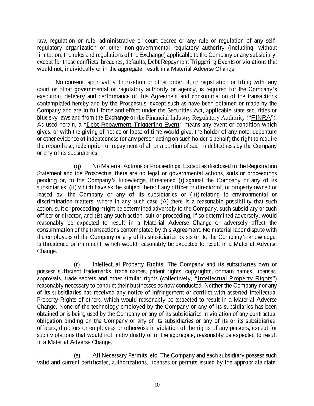 10 law, regulation or rule, administrative or court decree or any rule or regulation of any self- regulatory organization or other non-governmental regulatory authority (including, without limitation, the rules and regulations of the Exchange) applicable to the Company or any subsidiary, except for those conflicts, breaches, defaults, Debt Repayment Triggering Events or violations that would not, individually or in the aggregate, result in a Material Adverse Change. No consent, approval, authorization or other order of, or registration or filing with, any court or other governmental or regulatory authority or agency, is required for the Company’s execution, delivery and performance of this Agreement and consummation of the transactions contemplated hereby and by the Prospectus, except such as have been obtained or made by the Company and are in full force and effect under the Securities Act, applicable state securities or blue sky laws and from the Exchange or the Financial Industry Regulatory Authority (“FINRA”). As used herein, a “Debt Repayment Triggering Event” means any event or condition which gives, or with the giving of notice or lapse of time would give, the holder of any note, debenture or other evidence of indebtedness (or any person acting on such holder’s behalf) the right to require the repurchase, redemption or repayment of all or a portion of such indebtedness by the Company or any of its subsidiaries. (q) No Material Actions or Proceedings. Except as disclosed in the Registration Statement and the Prospectus, there are no legal or governmental actions, suits or proceedings pending or, to the Company’s knowledge, threatened (i) against the Company or any of its subsidiaries, (ii) which have as the subject thereof any officer or director of, or property owned or leased by, the Company or any of its subsidiaries or (iii) relating to environmental or discrimination matters, where in any such case (A) there is a reasonable possibility that such action, suit or proceeding might be determined adversely to the Company, such subsidiary or such officer or director, and (B) any such action, suit or proceeding, if so determined adversely, would reasonably be expected to result in a Material Adverse Change or adversely affect the consummation of the transactions contemplated by this Agreement. No material labor dispute with the employees of the Company or any of its subsidiaries exists or, to the Company’s knowledge, is threatened or imminent, which would reasonably be expected to result in a Material Adverse Change. (r) Intellectual Property Rights. The Company and its subsidiaries own or possess sufficient trademarks, trade names, patent rights, copyrights, domain names, licenses, approvals, trade secrets and other similar rights (collectively, “Intellectual Property Rights”) reasonably necessary to conduct their businesses as now conducted. Neither the Company nor any of its subsidiaries has received any notice of infringement or conflict with asserted Intellectual Property Rights of others, which would reasonably be expected to result in a Material Adverse Change. None of the technology employed by the Company or any of its subsidiaries has been obtained or is being used by the Company or any of its subsidiaries in violation of any contractual obligation binding on the Company or any of its subsidiaries or any of its or its subsidiaries’ officers, directors or employees or otherwise in violation of the rights of any persons, except for such violations that would not, individually or in the aggregate, reasonably be expected to result in a Material Adverse Change. (s) All Necessary Permits, etc. The Company and each subsidiary possess such valid and current certificates, authorizations, licenses or permits issued by the appropriate state,