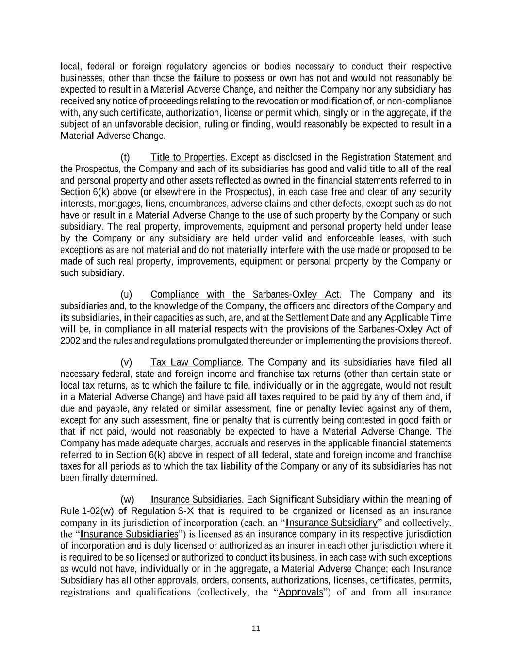 11 local, federal or foreign regulatory agencies or bodies necessary to conduct their respective businesses, other than those the failure to possess or own has not and would not reasonably be expected to result in a Material Adverse Change, and neither the Company nor any subsidiary has received any notice of proceedings relating to the revocation or modification of, or non-compliance with, any such certificate, authorization, license or permit which, singly or in the aggregate, if the subject of an unfavorable decision, ruling or finding, would reasonably be expected to result in a Material Adverse Change. (t) Title to Properties. Except as disclosed in the Registration Statement and the Prospectus, the Company and each of its subsidiaries has good and valid title to all of the real and personal property and other assets reflected as owned in the financial statements referred to in Section 6(k) above (or elsewhere in the Prospectus), in each case free and clear of any security interests, mortgages, liens, encumbrances, adverse claims and other defects, except such as do not have or result in a Material Adverse Change to the use of such property by the Company or such subsidiary. The real property, improvements, equipment and personal property held under lease by the Company or any subsidiary are held under valid and enforceable leases, with such exceptions as are not material and do not materially interfere with the use made or proposed to be made of such real property, improvements, equipment or personal property by the Company or such subsidiary. (u) Compliance with the Sarbanes-Oxley Act. The Company and its subsidiaries and, to the knowledge of the Company, the officers and directors of the Company and its subsidiaries, in their capacities as such, are, and at the Settlement Date and any Applicable Time will be, in compliance in all material respects with the provisions of the Sarbanes-Oxley Act of 2002 and the rules and regulations promulgated thereunder or implementing the provisions thereof. (v) Tax Law Compliance. The Company and its subsidiaries have filed all necessary federal, state and foreign income and franchise tax returns (other than certain state or local tax returns, as to which the failure to file, individually or in the aggregate, would not result in a Material Adverse Change) and have paid all taxes required to be paid by any of them and, if due and payable, any related or similar assessment, fine or penalty levied against any of them, except for any such assessment, fine or penalty that is currently being contested in good faith or that if not paid, would not reasonably be expected to have a Material Adverse Change. The Company has made adequate charges, accruals and reserves in the applicable financial statements referred to in Section 6(k) above in respect of all federal, state and foreign income and franchise taxes for all periods as to which the tax liability of the Company or any of its subsidiaries has not been finally determined. (w) Insurance Subsidiaries. Each Significant Subsidiary within the meaning of Rule 1-02(w) of Regulation S-X that is required to be organized or licensed as an insurance company in its jurisdiction of incorporation (each, an “Insurance Subsidiary” and collectively, the “Insurance Subsidiaries”) is licensed as an insurance company in its respective jurisdiction of incorporation and is duly licensed or authorized as an insurer in each other jurisdiction where it is required to be so licensed or authorized to conduct its business, in each case with such exceptions as would not have, individually or in the aggregate, a Material Adverse Change; each Insurance Subsidiary has all other approvals, orders, consents, authorizations, licenses, certificates, permits, registrations and qualifications (collectively, the “Approvals”) of and from all insurance