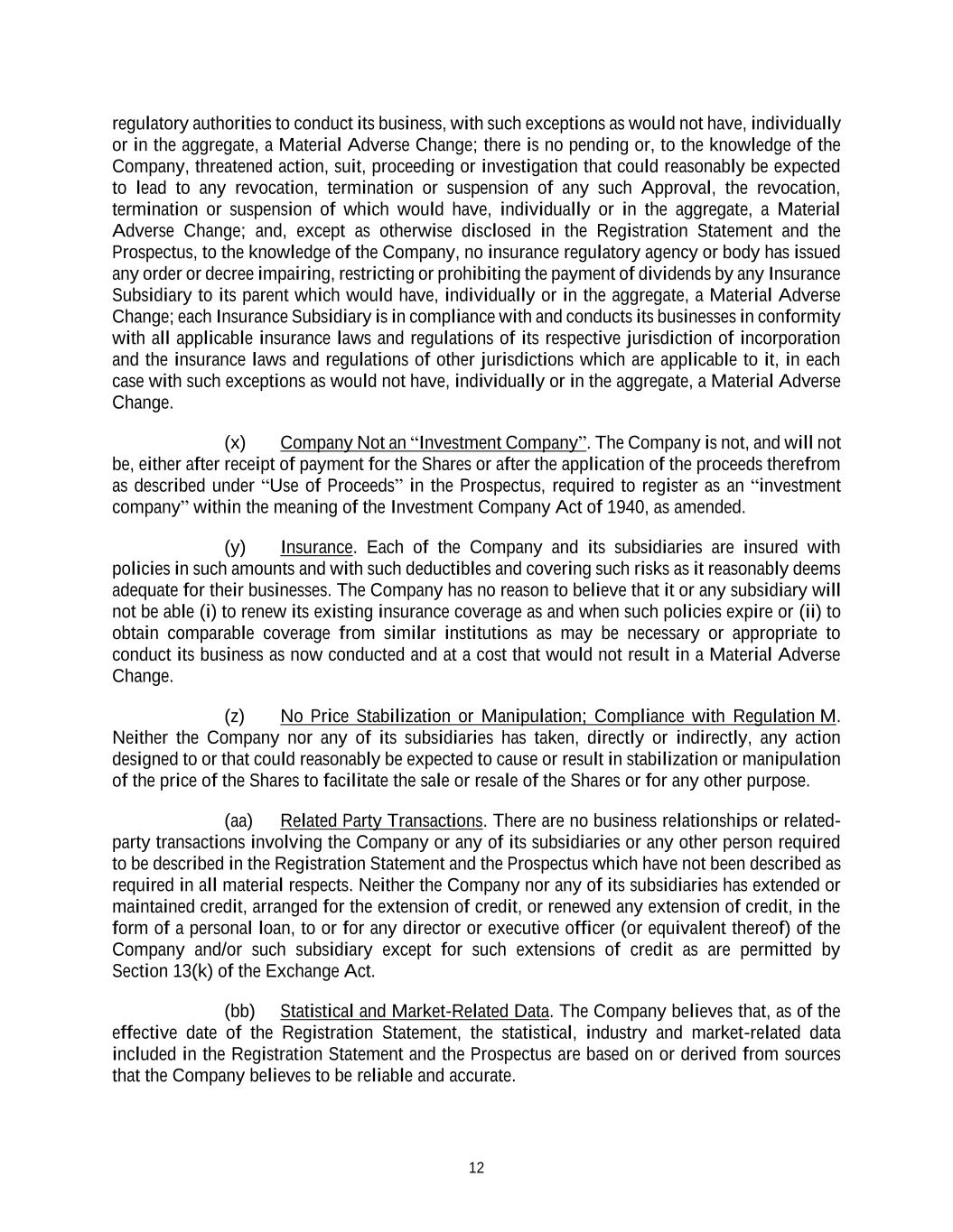 12 regulatory authorities to conduct its business, with such exceptions as would not have, individually or in the aggregate, a Material Adverse Change; there is no pending or, to the knowledge of the Company, threatened action, suit, proceeding or investigation that could reasonably be expected to lead to any revocation, termination or suspension of any such Approval, the revocation, termination or suspension of which would have, individually or in the aggregate, a Material Adverse Change; and, except as otherwise disclosed in the Registration Statement and the Prospectus, to the knowledge of the Company, no insurance regulatory agency or body has issued any order or decree impairing, restricting or prohibiting the payment of dividends by any Insurance Subsidiary to its parent which would have, individually or in the aggregate, a Material Adverse Change; each Insurance Subsidiary is in compliance with and conducts its businesses in conformity with all applicable insurance laws and regulations of its respective jurisdiction of incorporation and the insurance laws and regulations of other jurisdictions which are applicable to it, in each case with such exceptions as would not have, individually or in the aggregate, a Material Adverse Change. (x) Company Not an “Investment Company”. The Company is not, and will not be, either after receipt of payment for the Shares or after the application of the proceeds therefrom as described under “Use of Proceeds” in the Prospectus, required to register as an “investment company” within the meaning of the Investment Company Act of 1940, as amended. (y) Insurance. Each of the Company and its subsidiaries are insured with policies in such amounts and with such deductibles and covering such risks as it reasonably deems adequate for their businesses. The Company has no reason to believe that it or any subsidiary will not be able (i) to renew its existing insurance coverage as and when such policies expire or (ii) to obtain comparable coverage from similar institutions as may be necessary or appropriate to conduct its business as now conducted and at a cost that would not result in a Material Adverse Change. (z) No Price Stabilization or Manipulation; Compliance with Regulation M. Neither the Company nor any of its subsidiaries has taken, directly or indirectly, any action designed to or that could reasonably be expected to cause or result in stabilization or manipulation of the price of the Shares to facilitate the sale or resale of the Shares or for any other purpose. (aa) Related Party Transactions. There are no business relationships or related- party transactions involving the Company or any of its subsidiaries or any other person required to be described in the Registration Statement and the Prospectus which have not been described as required in all material respects. Neither the Company nor any of its subsidiaries has extended or maintained credit, arranged for the extension of credit, or renewed any extension of credit, in the form of a personal loan, to or for any director or executive officer (or equivalent thereof) of the Company and/or such subsidiary except for such extensions of credit as are permitted by Section 13(k) of the Exchange Act. (bb) Statistical and Market-Related Data. The Company believes that, as of the effective date of the Registration Statement, the statistical, industry and market-related data included in the Registration Statement and the Prospectus are based on or derived from sources that the Company believes to be reliable and accurate.