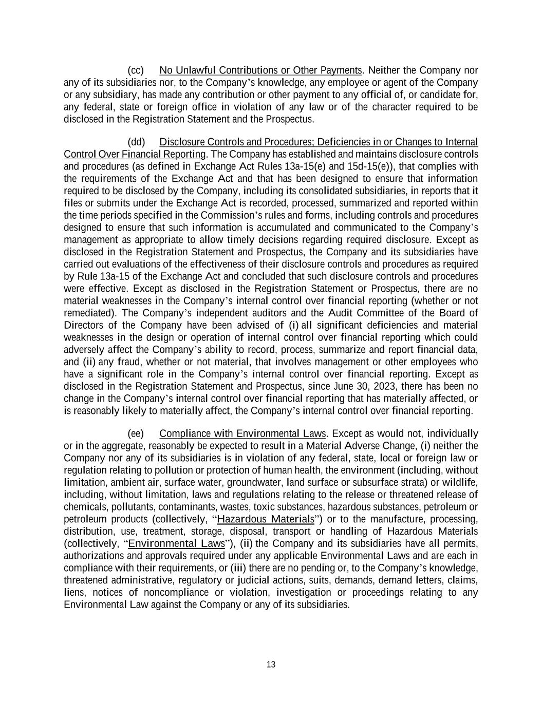 13 (cc) No Unlawful Contributions or Other Payments. Neither the Company nor any of its subsidiaries nor, to the Company’s knowledge, any employee or agent of the Company or any subsidiary, has made any contribution or other payment to any official of, or candidate for, any federal, state or foreign office in violation of any law or of the character required to be disclosed in the Registration Statement and the Prospectus. (dd) Disclosure Controls and Procedures; Deficiencies in or Changes to Internal Control Over Financial Reporting. The Company has established and maintains disclosure controls and procedures (as defined in Exchange Act Rules 13a-15(e) and 15d-15(e)), that complies with the requirements of the Exchange Act and that has been designed to ensure that information required to be disclosed by the Company, including its consolidated subsidiaries, in reports that it files or submits under the Exchange Act is recorded, processed, summarized and reported within the time periods specified in the Commission’s rules and forms, including controls and procedures designed to ensure that such information is accumulated and communicated to the Company’s management as appropriate to allow timely decisions regarding required disclosure. Except as disclosed in the Registration Statement and Prospectus, the Company and its subsidiaries have carried out evaluations of the effectiveness of their disclosure controls and procedures as required by Rule 13a-15 of the Exchange Act and concluded that such disclosure controls and procedures were effective. Except as disclosed in the Registration Statement or Prospectus, there are no material weaknesses in the Company’s internal control over financial reporting (whether or not remediated). The Company’s independent auditors and the Audit Committee of the Board of Directors of the Company have been advised of (i) all significant deficiencies and material weaknesses in the design or operation of internal control over financial reporting which could adversely affect the Company’s ability to record, process, summarize and report financial data, and (ii) any fraud, whether or not material, that involves management or other employees who have a significant role in the Company’s internal control over financial reporting. Except as disclosed in the Registration Statement and Prospectus, since June 30, 2023, there has been no change in the Company’s internal control over financial reporting that has materially affected, or is reasonably likely to materially affect, the Company’s internal control over financial reporting. (ee) Compliance with Environmental Laws. Except as would not, individually or in the aggregate, reasonably be expected to result in a Material Adverse Change, (i) neither the Company nor any of its subsidiaries is in violation of any federal, state, local or foreign law or regulation relating to pollution or protection of human health, the environment (including, without limitation, ambient air, surface water, groundwater, land surface or subsurface strata) or wildlife, including, without limitation, laws and regulations relating to the release or threatened release of chemicals, pollutants, contaminants, wastes, toxic substances, hazardous substances, petroleum or petroleum products (collectively, “Hazardous Materials”) or to the manufacture, processing, distribution, use, treatment, storage, disposal, transport or handling of Hazardous Materials (collectively, “Environmental Laws”), (ii) the Company and its subsidiaries have all permits, authorizations and approvals required under any applicable Environmental Laws and are each in compliance with their requirements, or (iii) there are no pending or, to the Company’s knowledge, threatened administrative, regulatory or judicial actions, suits, demands, demand letters, claims, liens, notices of noncompliance or violation, investigation or proceedings relating to any Environmental Law against the Company or any of its subsidiaries.
