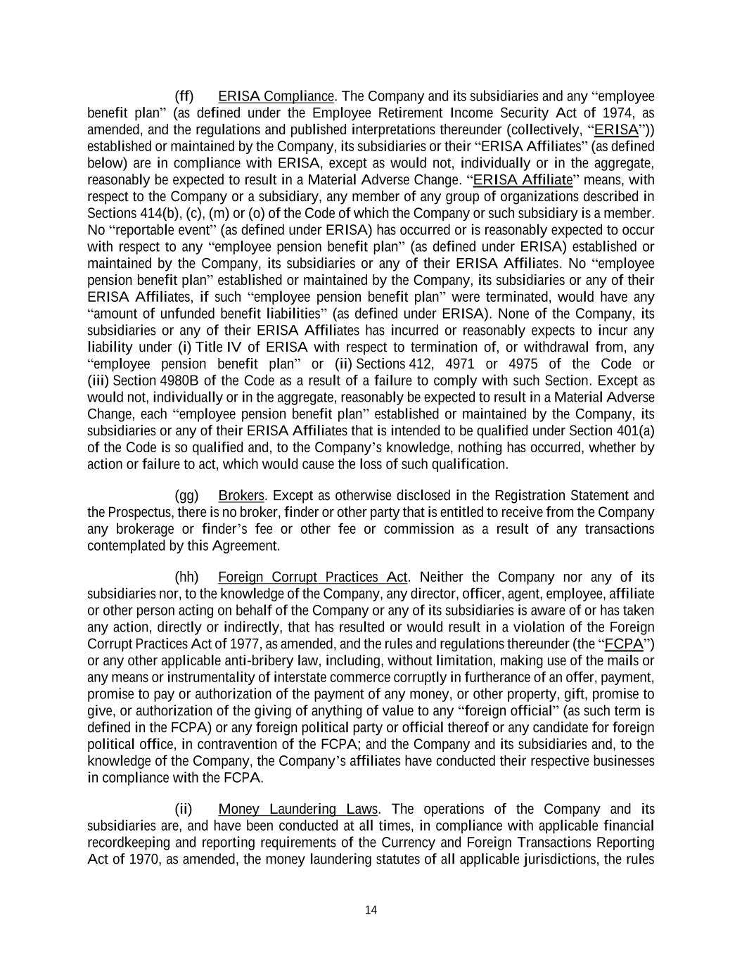 14 (ff) ERISA Compliance. The Company and its subsidiaries and any “employee benefit plan” (as defined under the Employee Retirement Income Security Act of 1974, as amended, and the regulations and published interpretations thereunder (collectively, “ERISA”)) established or maintained by the Company, its subsidiaries or their “ERISA Affiliates” (as defined below) are in compliance with ERISA, except as would not, individually or in the aggregate, reasonably be expected to result in a Material Adverse Change. “ERISA Affiliate” means, with respect to the Company or a subsidiary, any member of any group of organizations described in Sections 414(b), (c), (m) or (o) of the Code of which the Company or such subsidiary is a member. No “reportable event” (as defined under ERISA) has occurred or is reasonably expected to occur with respect to any “employee pension benefit plan” (as defined under ERISA) established or maintained by the Company, its subsidiaries or any of their ERISA Affiliates. No “employee pension benefit plan” established or maintained by the Company, its subsidiaries or any of their ERISA Affiliates, if such “employee pension benefit plan” were terminated, would have any “amount of unfunded benefit liabilities” (as defined under ERISA). None of the Company, its subsidiaries or any of their ERISA Affiliates has incurred or reasonably expects to incur any liability under (i) Title IV of ERISA with respect to termination of, or withdrawal from, any “employee pension benefit plan” or (ii) Sections 412, 4971 or 4975 of the Code or (iii) Section 4980B of the Code as a result of a failure to comply with such Section. Except as would not, individually or in the aggregate, reasonably be expected to result in a Material Adverse Change, each “employee pension benefit plan” established or maintained by the Company, its subsidiaries or any of their ERISA Affiliates that is intended to be qualified under Section 401(a) of the Code is so qualified and, to the Company’s knowledge, nothing has occurred, whether by action or failure to act, which would cause the loss of such qualification. (gg) Brokers. Except as otherwise disclosed in the Registration Statement and the Prospectus, there is no broker, finder or other party that is entitled to receive from the Company any brokerage or finder’s fee or other fee or commission as a result of any transactions contemplated by this Agreement. (hh) Foreign Corrupt Practices Act. Neither the Company nor any of its subsidiaries nor, to the knowledge of the Company, any director, officer, agent, employee, affiliate or other person acting on behalf of the Company or any of its subsidiaries is aware of or has taken any action, directly or indirectly, that has resulted or would result in a violation of the Foreign Corrupt Practices Act of 1977, as amended, and the rules and regulations thereunder (the “FCPA”) or any other applicable anti-bribery law, including, without limitation, making use of the mails or any means or instrumentality of interstate commerce corruptly in furtherance of an offer, payment, promise to pay or authorization of the payment of any money, or other property, gift, promise to give, or authorization of the giving of anything of value to any “foreign official” (as such term is defined in the FCPA) or any foreign political party or official thereof or any candidate for foreign political office, in contravention of the FCPA; and the Company and its subsidiaries and, to the knowledge of the Company, the Company’s affiliates have conducted their respective businesses in compliance with the FCPA. (ii) Money Laundering Laws. The operations of the Company and its subsidiaries are, and have been conducted at all times, in compliance with applicable financial recordkeeping and reporting requirements of the Currency and Foreign Transactions Reporting Act of 1970, as amended, the money laundering statutes of all applicable jurisdictions, the rules