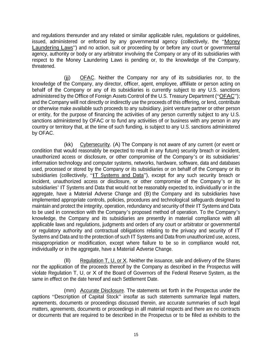 15 and regulations thereunder and any related or similar applicable rules, regulations or guidelines, issued, administered or enforced by any governmental agency (collectively, the “Money Laundering Laws”) and no action, suit or proceeding by or before any court or governmental agency, authority or body or any arbitrator involving the Company or any of its subsidiaries with respect to the Money Laundering Laws is pending or, to the knowledge of the Company, threatened. (jj) OFAC. Neither the Company nor any of its subsidiaries nor, to the knowledge of the Company, any director, officer, agent, employee, affiliate or person acting on behalf of the Company or any of its subsidiaries is currently subject to any U.S. sanctions administered by the Office of Foreign Assets Control of the U.S. Treasury Department (“OFAC”); and the Company will not directly or indirectly use the proceeds of this offering, or lend, contribute or otherwise make available such proceeds to any subsidiary, joint venture partner or other person or entity, for the purpose of financing the activities of any person currently subject to any U.S. sanctions administered by OFAC or to fund any activities of or business with any person in any country or territory that, at the time of such funding, is subject to any U.S. sanctions administered by OFAC. (kk) Cybersecurity. (A) The Company is not aware of any current (or event or condition that would reasonably be expected to result in any future) security breach or incident, unauthorized access or disclosure, or other compromise of the Company’s or its subsidiaries’ information technology and computer systems, networks, hardware, software, data and databases used, processed or stored by the Company or its subsidiaries or on behalf of the Company or its subsidiaries (collectively, “IT Systems and Data”), except for any such security breach or incident, unauthorized access or disclosure, or other compromise of the Company’s or its subsidiaries’ IT Systems and Data that would not be reasonably expected to, individually or in the aggregate, have a Material Adverse Change and (B) the Company and its subsidiaries have implemented appropriate controls, policies, procedures and technological safeguards designed to maintain and protect the integrity, operation, redundancy and security of their IT Systems and Data to be used in connection with the Company’s proposed method of operation. To the Company’s knowledge, the Company and its subsidiaries are presently in material compliance with all applicable laws and regulations, judgments and orders of any court or arbitrator or governmental or regulatory authority and contractual obligations relating to the privacy and security of IT Systems and Data and to the protection of such IT Systems and Data from unauthorized use, access, misappropriation or modification, except where failure to be so in compliance would not, individually or in the aggregate, have a Material Adverse Change. (ll) Regulation T, U, or X. Neither the issuance, sale and delivery of the Shares nor the application of the proceeds thereof by the Company as described in the Prospectus will violate Regulation T, U, or X of the Board of Governors of the Federal Reserve System, as the same in effect on the date hereof and each Settlement Date. (mm) Accurate Disclosure. The statements set forth in the Prospectus under the captions “Description of Capital Stock” insofar as such statements summarize legal matters, agreements, documents or proceedings discussed therein, are accurate summaries of such legal matters, agreements, documents or proceedings in all material respects and there are no contracts or documents that are required to be described in the Prospectus or to be filed as exhibits to the